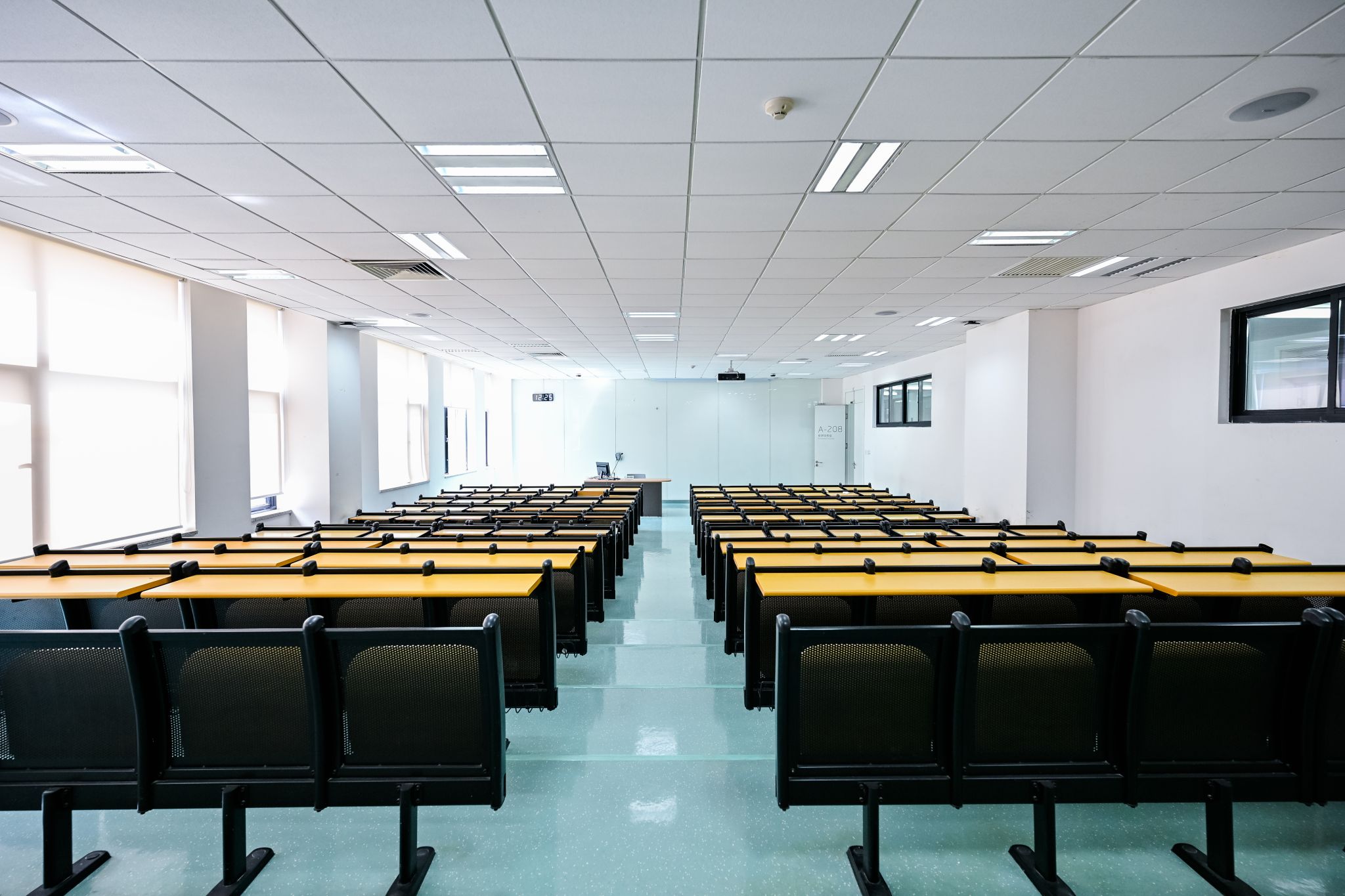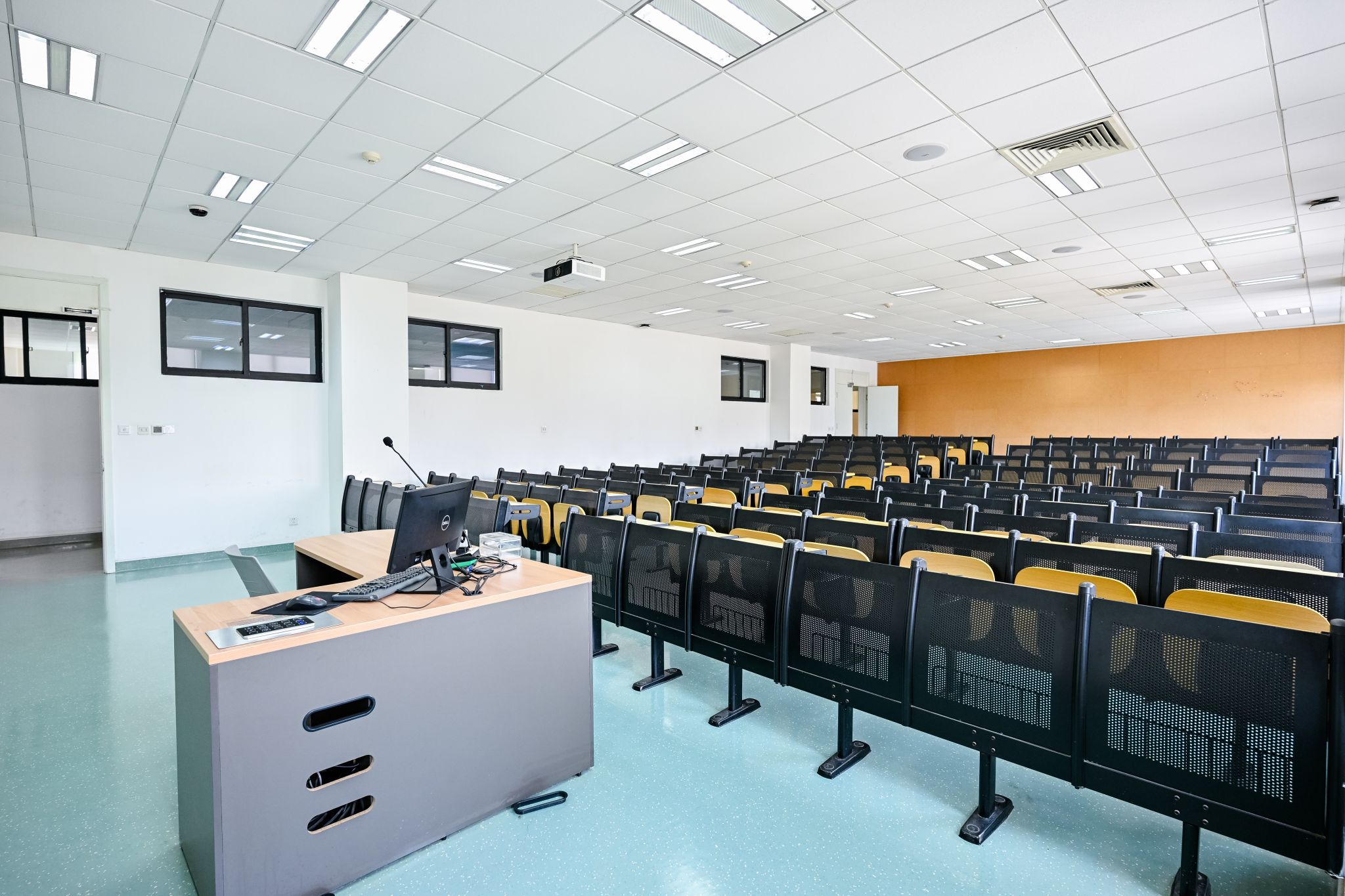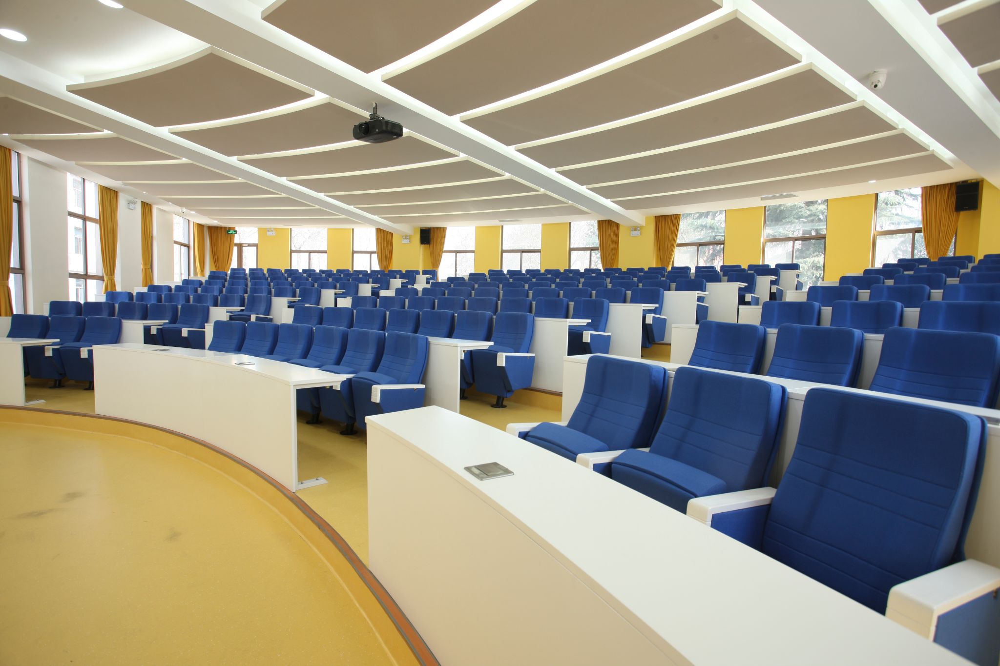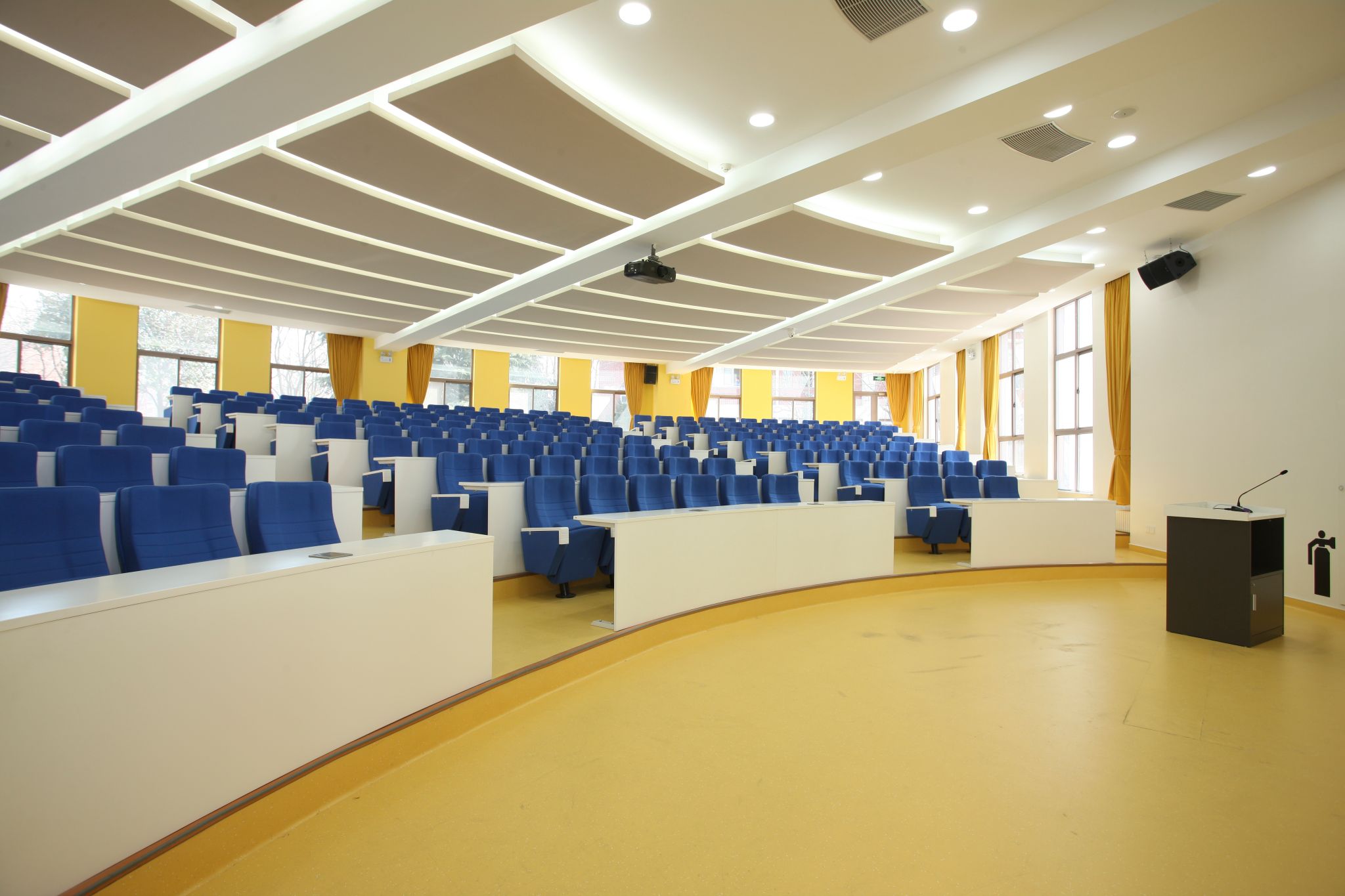 The West C Building houses two multifunctional tiered classrooms, each with a capacity of over 200 individuals. The rooms adopt yellow-blue and orange-red color schemes—yellow invigorates thinking, blue fosters calm and sustained focus, and orange-red ignites enthusiasm. Together, these elements cultivate a rigorous and vibrant teaching environment. The classrooms support large-class teaching scenarios. Moreover, they are equipped with professional audiovisual systems, making them ideal for academic seminars, class and club meetings, and other events.