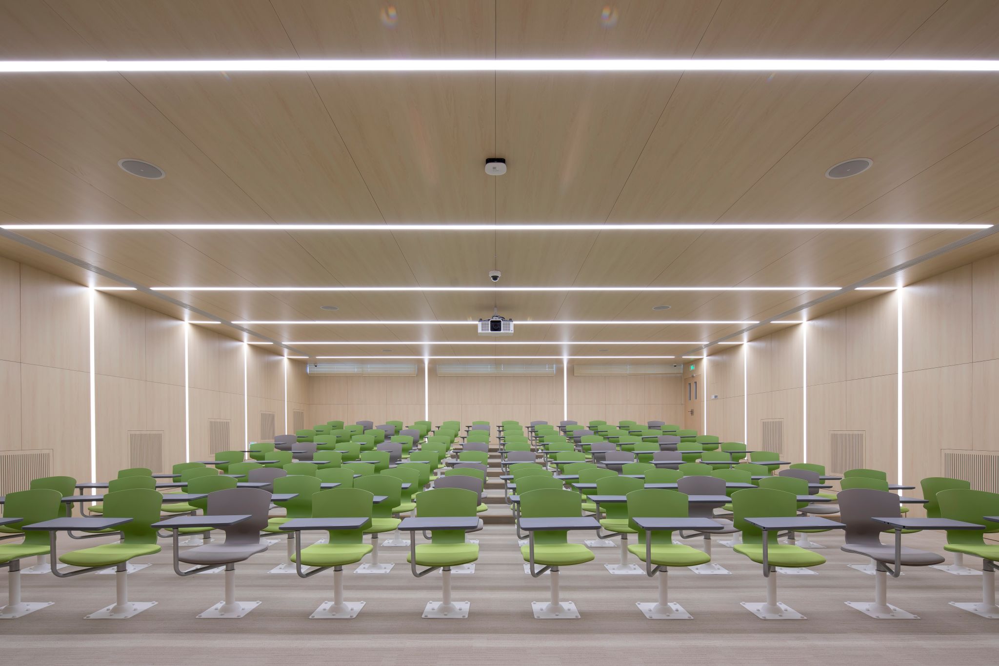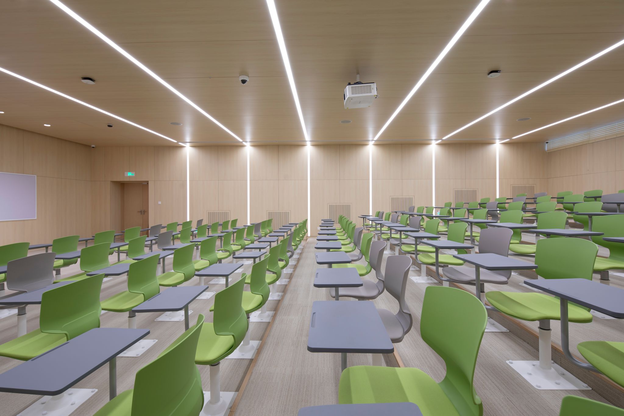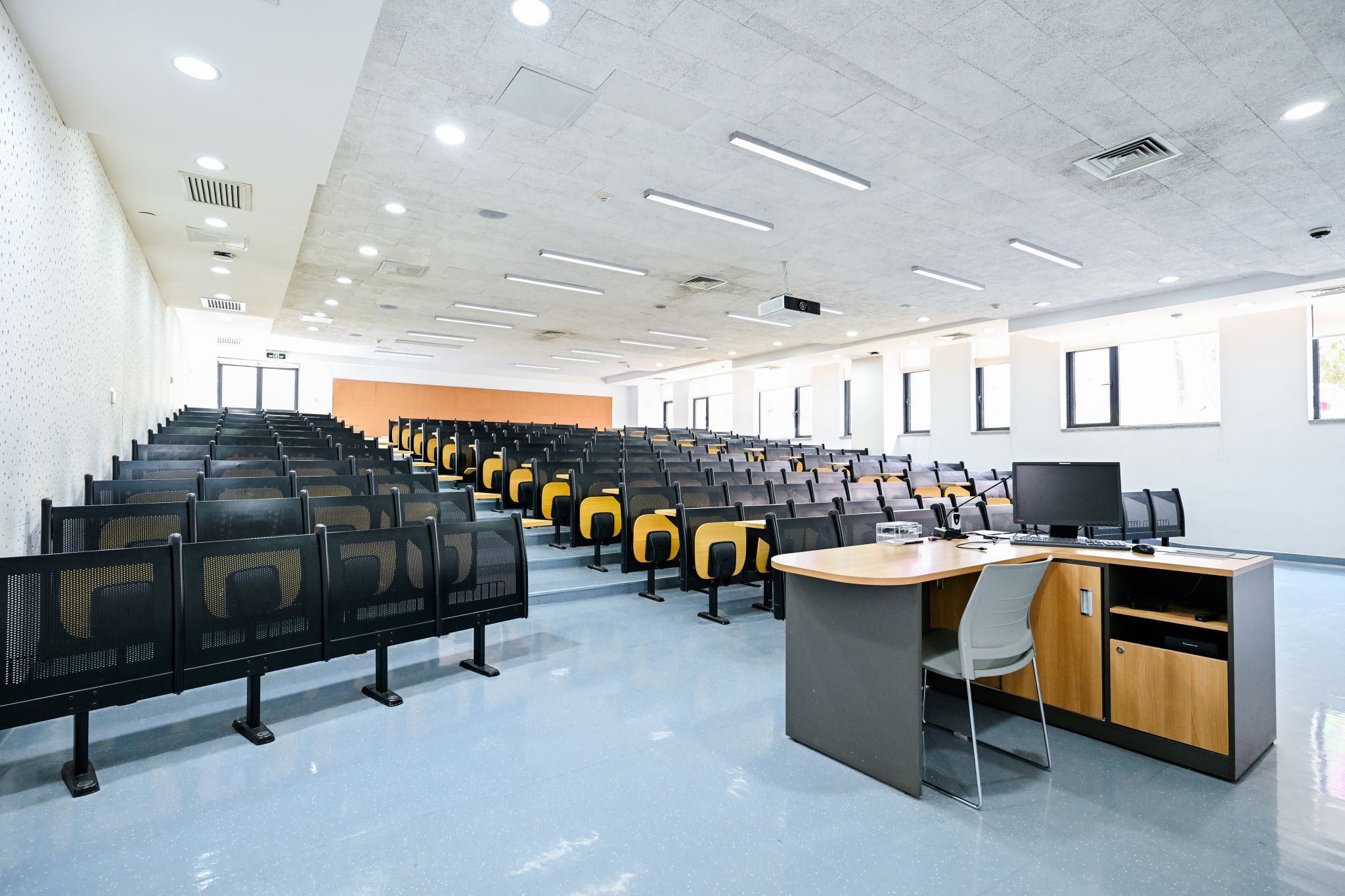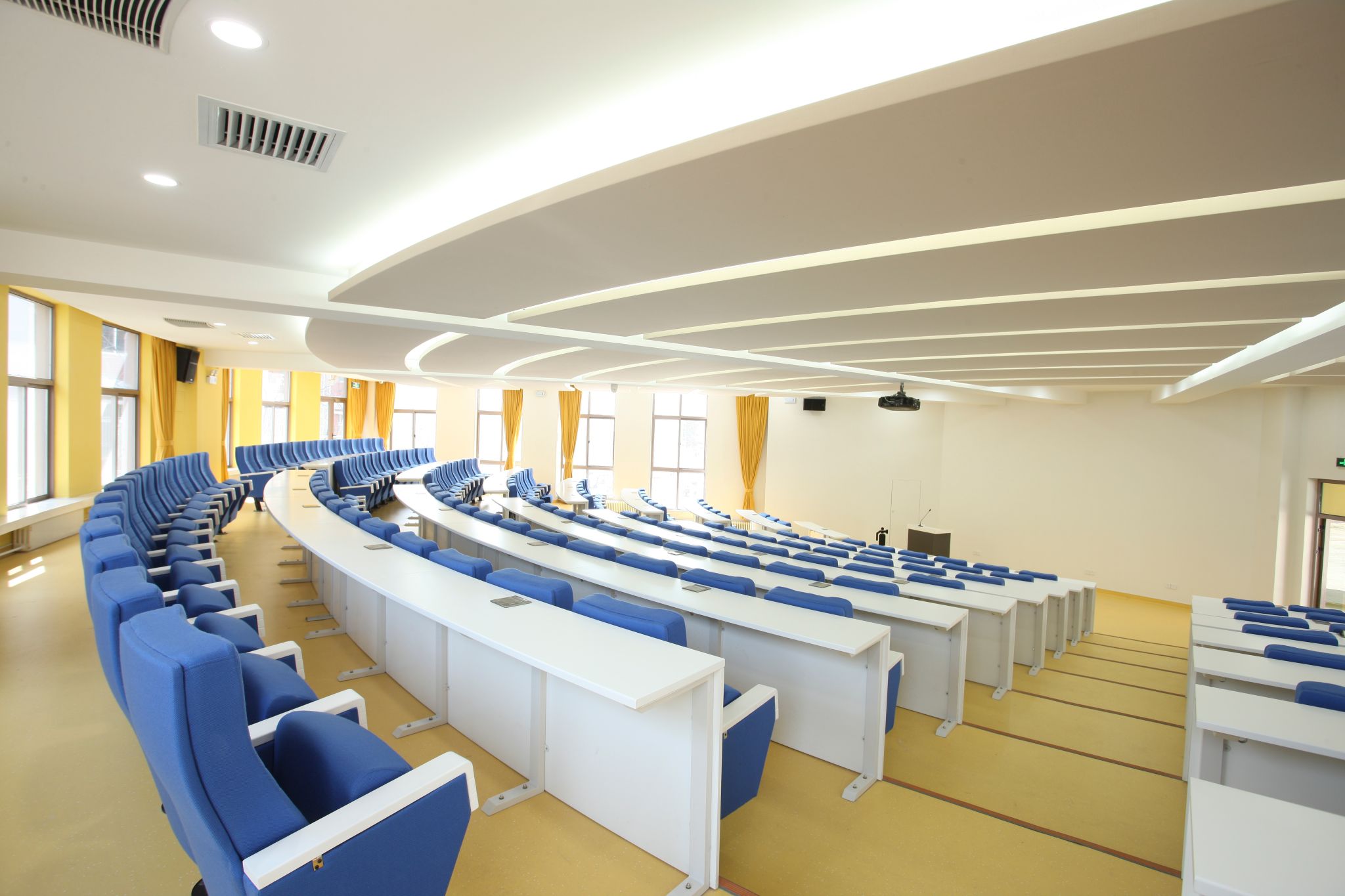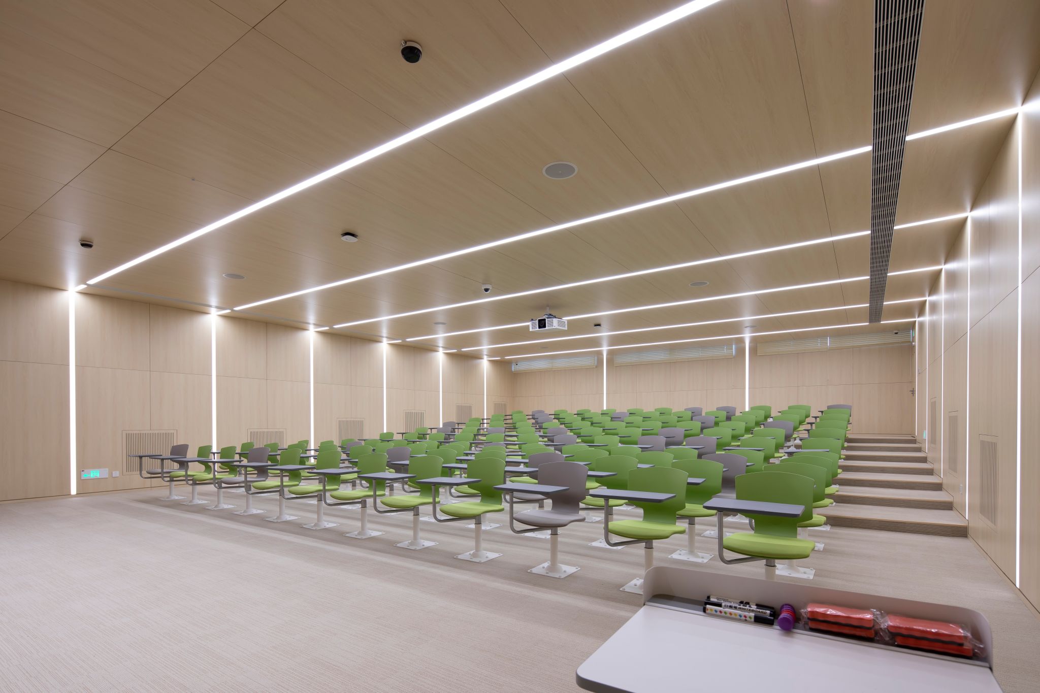 The West C Building houses two multifunctional tiered classrooms, each with a capacity of over 200 individuals. The rooms adopt yellow-blue and orange-red color schemes—yellow invigorates thinking, blue fosters calm and sustained focus, and orange-red ignites enthusiasm. Together, these elements cultivate a rigorous and vibrant teaching environment. The classrooms support large-class teaching scenarios....