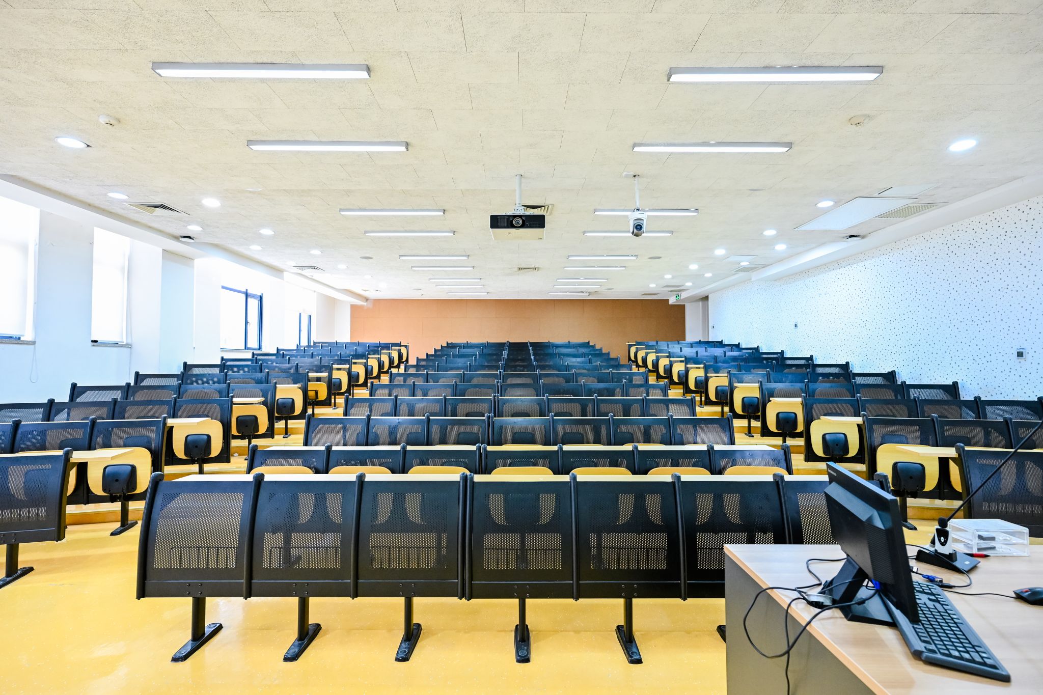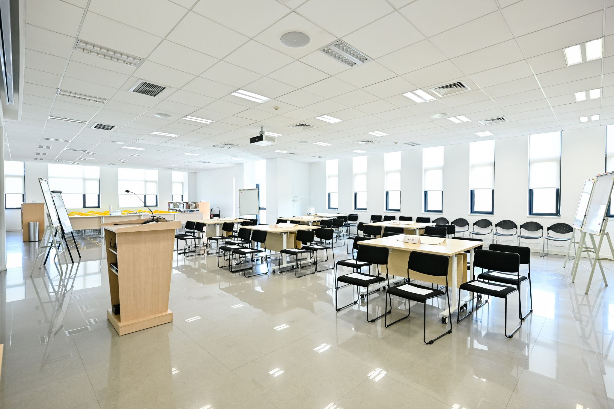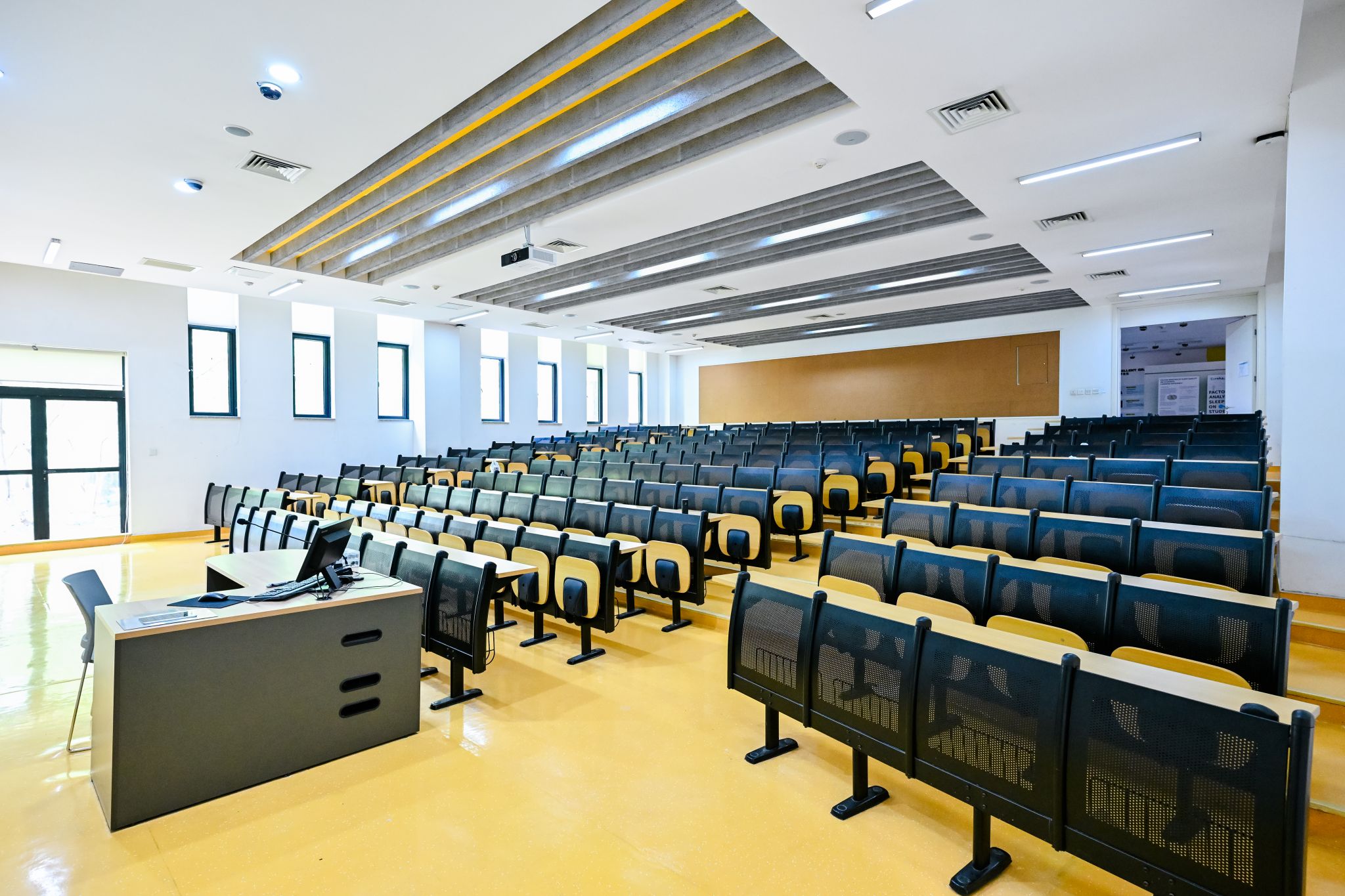 The Multifunctional Lecture Hall (Room 16) at the Students Activity Center can seat 120 attendees. It is equipped with professional lighting and sound systems, along with movable modular tables and chairs. The adaptable space supports academic forums, lectures, workshops, and club events.