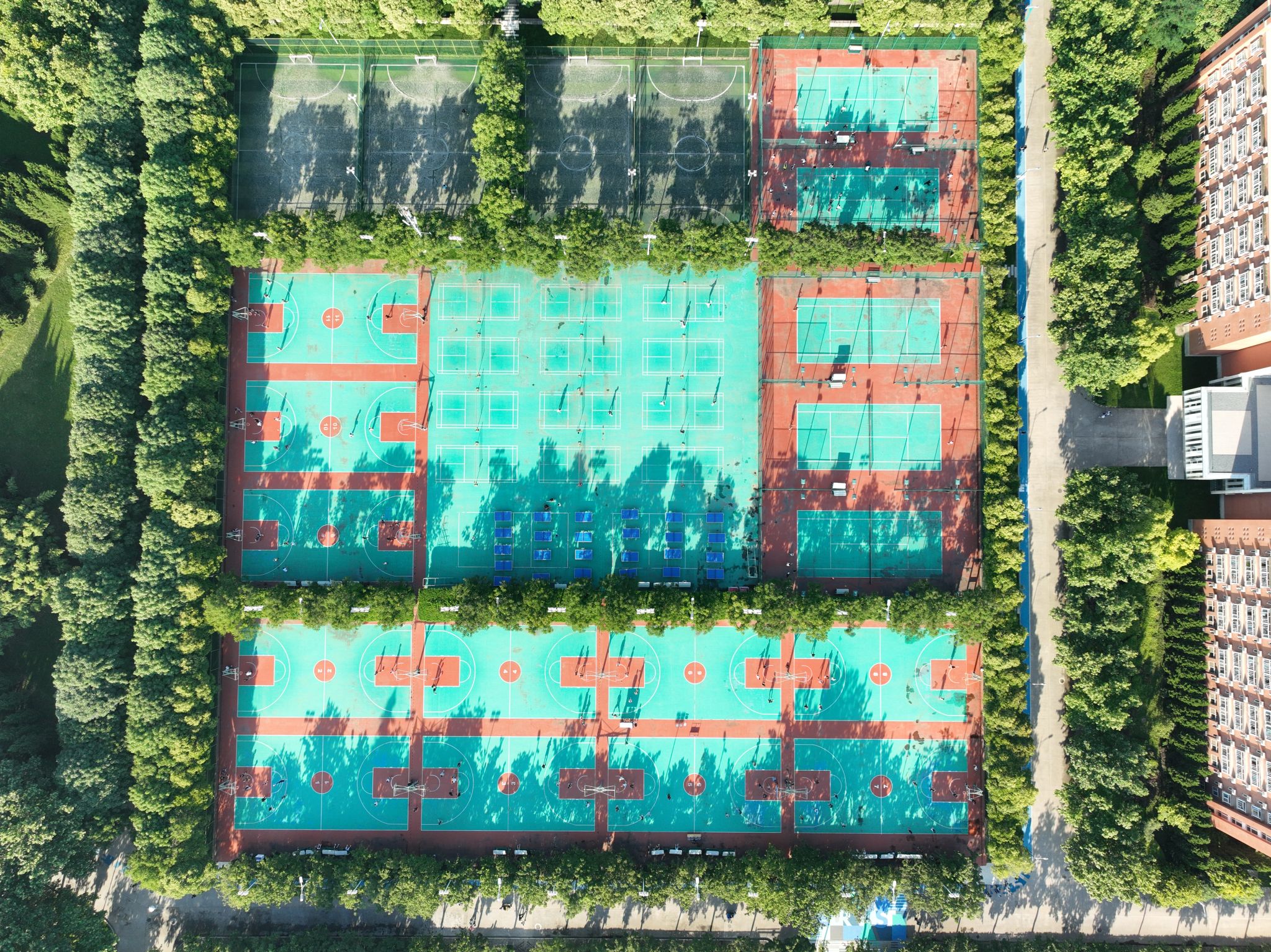 The comprehensive outdoor sports court, completed in September 2016, spans 14,000 square meters. It is composed of 11 basketball courts, 4 five-a-side football fields, 5 tennis courts, 15 badminton courts, 25 table tennis areas, and 2 volleyball courts.