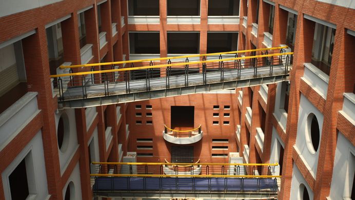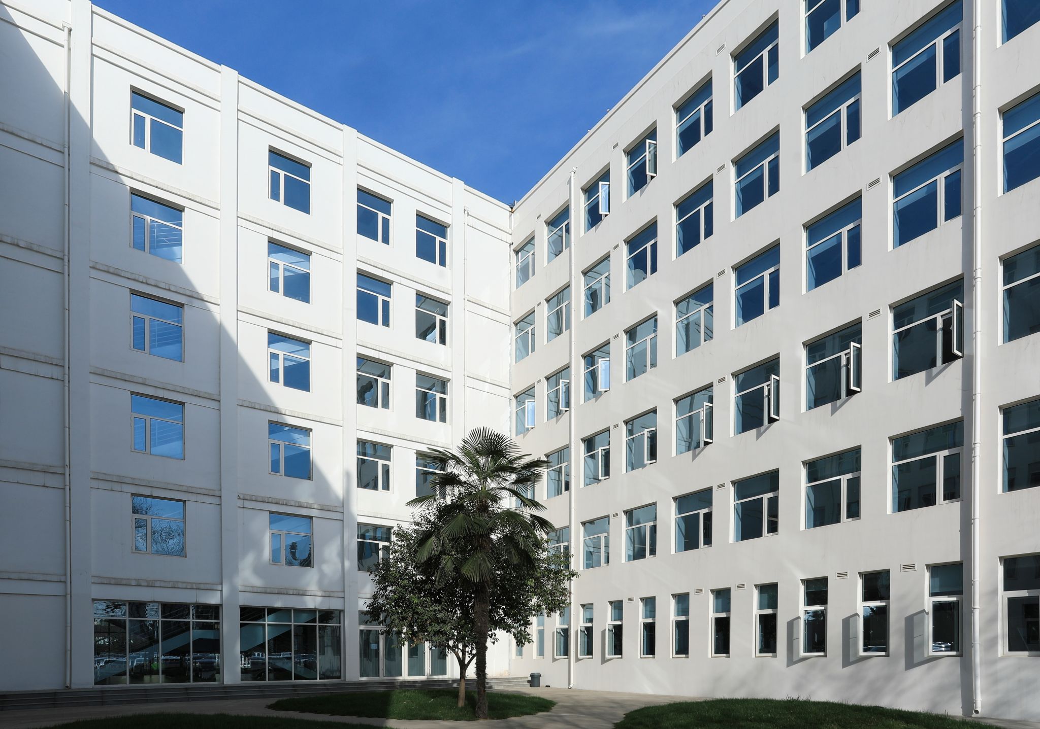 Located on the west side of the Administrative Center, the facility constitutes the core public space of the university, together with the teaching complex on the north side. The external facade is decorated with red bricks and white paint, complemented by gray bricks and glass, creating a three-dimensional architectural style. In terms of space, the use of a modular window design enables the unification of various parts while achieving the variety in the ways of opening windows for the red, white, and gray sections. The three-back-shaped structure adopts an end-to-end courtyard layout to encompass the teaching blocks of four schools, namely, the Eurasia Art and Design School, the School of Culture & Media, the School of Data Science, and the School of Accounting and Finance.