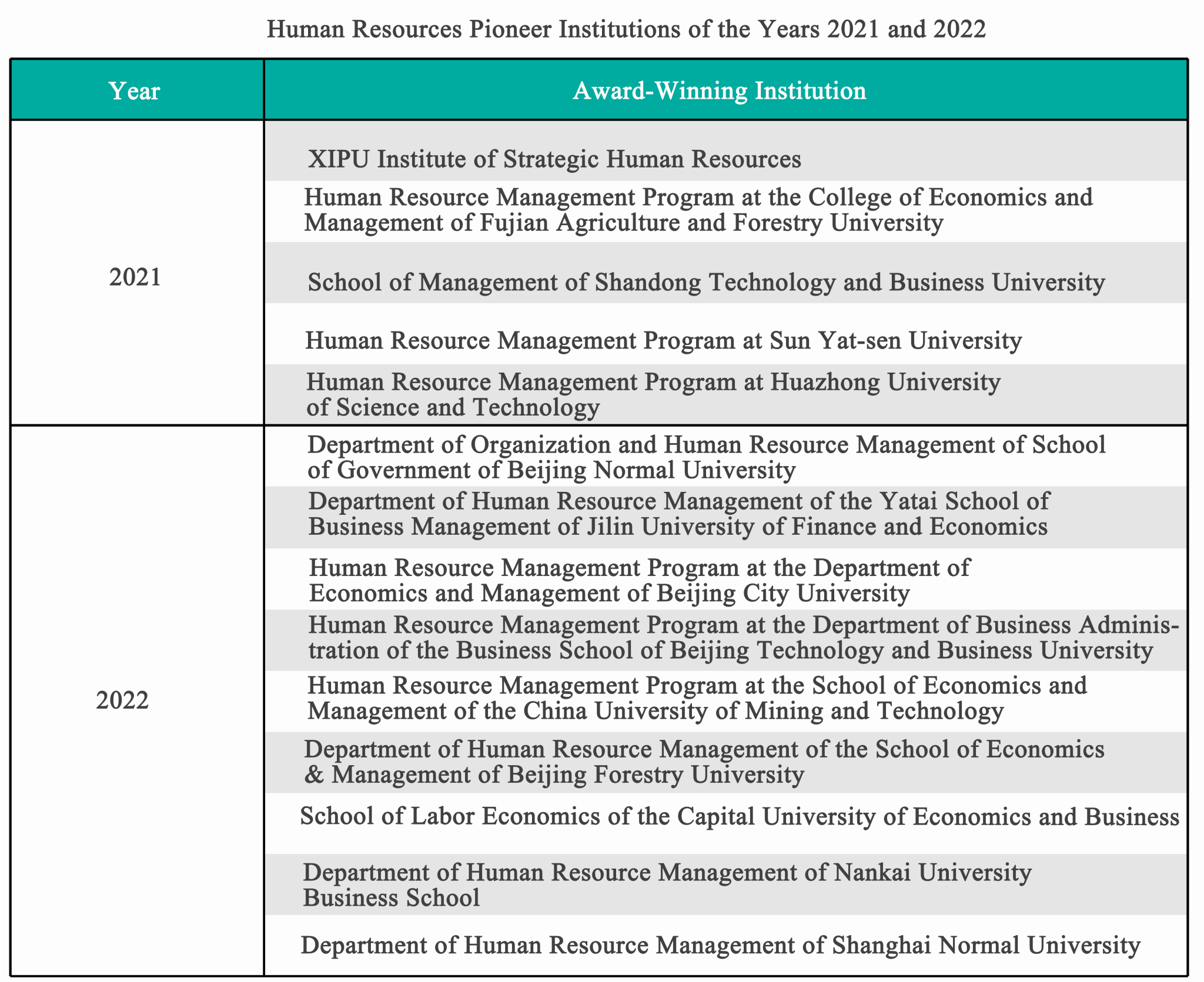 The Human Resources Pioneer Award has undergone sixteen years of development and accumulation, and it has become a highly authoritative, influential, and widely recognized professional award event in the human resources industry. The institutions that have received the "Human Resources Pioneer Institution" award in the past three years include the XIPU Institute of Strategic Human Resources, Sun Yat-sen University, Huazhong University of Science and Technology, Nankai University, Capital University of Economics and Business, and Beijing Normal University.