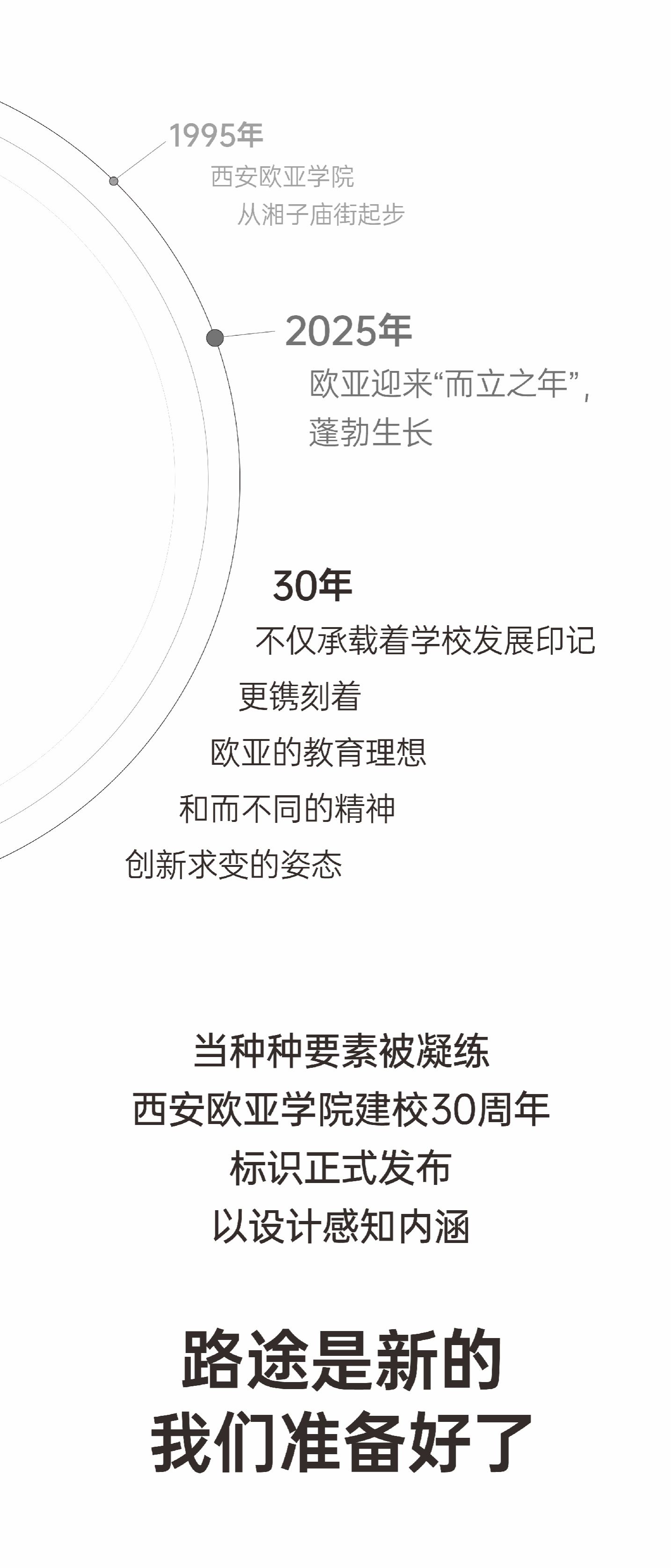 In terms of the overall structure, the logo removes unnecessary design elements and leaves a large space blank to give the expression of the circle the sense of "opening and linking". It implies that on a new path, the 30-year-old Xi'an Eurasia University will keep moving forward and strive for further development and more achievements in the process of advancing open education and industry-education integration through exchange and cooperation.