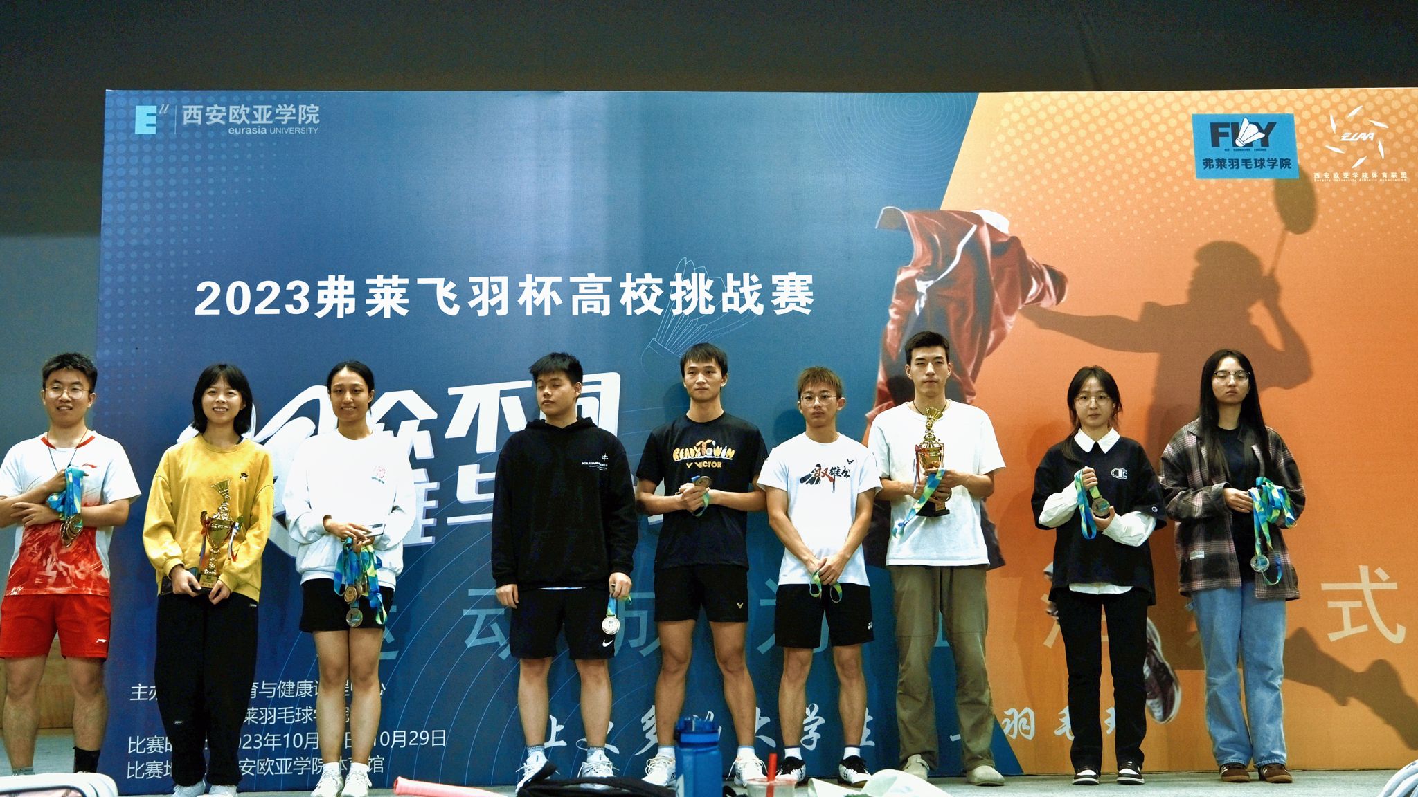 10月28日-29日,我校通识教育学院主办的首届“弗莱飞羽杯”陕西高校羽毛球挑战赛在体育馆举行。来自西安交通大学、西安电子科技大学、西安建筑科技大学、西安外国语大学、西安邮电大学、西安财经大学、西北政法大学和西安欧亚学院的8个代表队、100余名选手参赛,共享羽球盛宴。