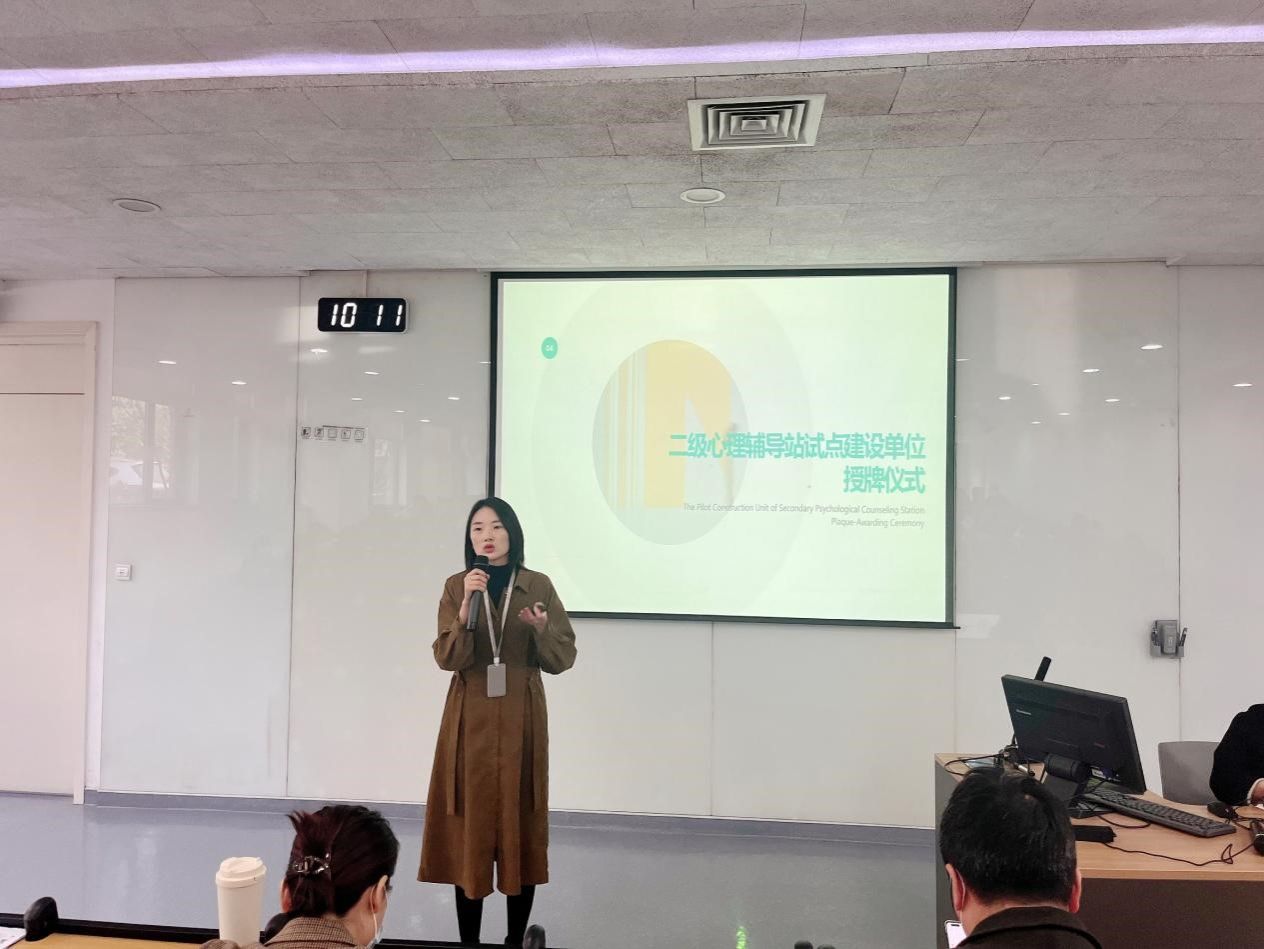 会议伊始,学生心理咨询中心主任万红对二级心理辅导站建设情况进行了介绍。学生发展处副处长张成对二级心理辅导站总体规划及运行模式进行了讲解,他对两个二级心理辅导站试点建设单位的工作开展情况给予了肯定,同时提到2024年9月学校将会在社区全面开展二级心理辅导站建设工作。随后,由学生发展处处长董杨为两个二级心理辅导站试点建设单位乐乎二级心理辅导站、I²二级心理辅导站进行授牌。