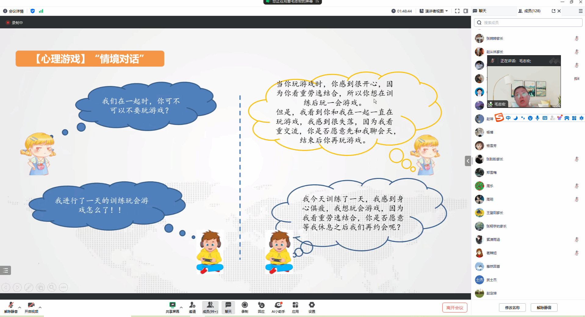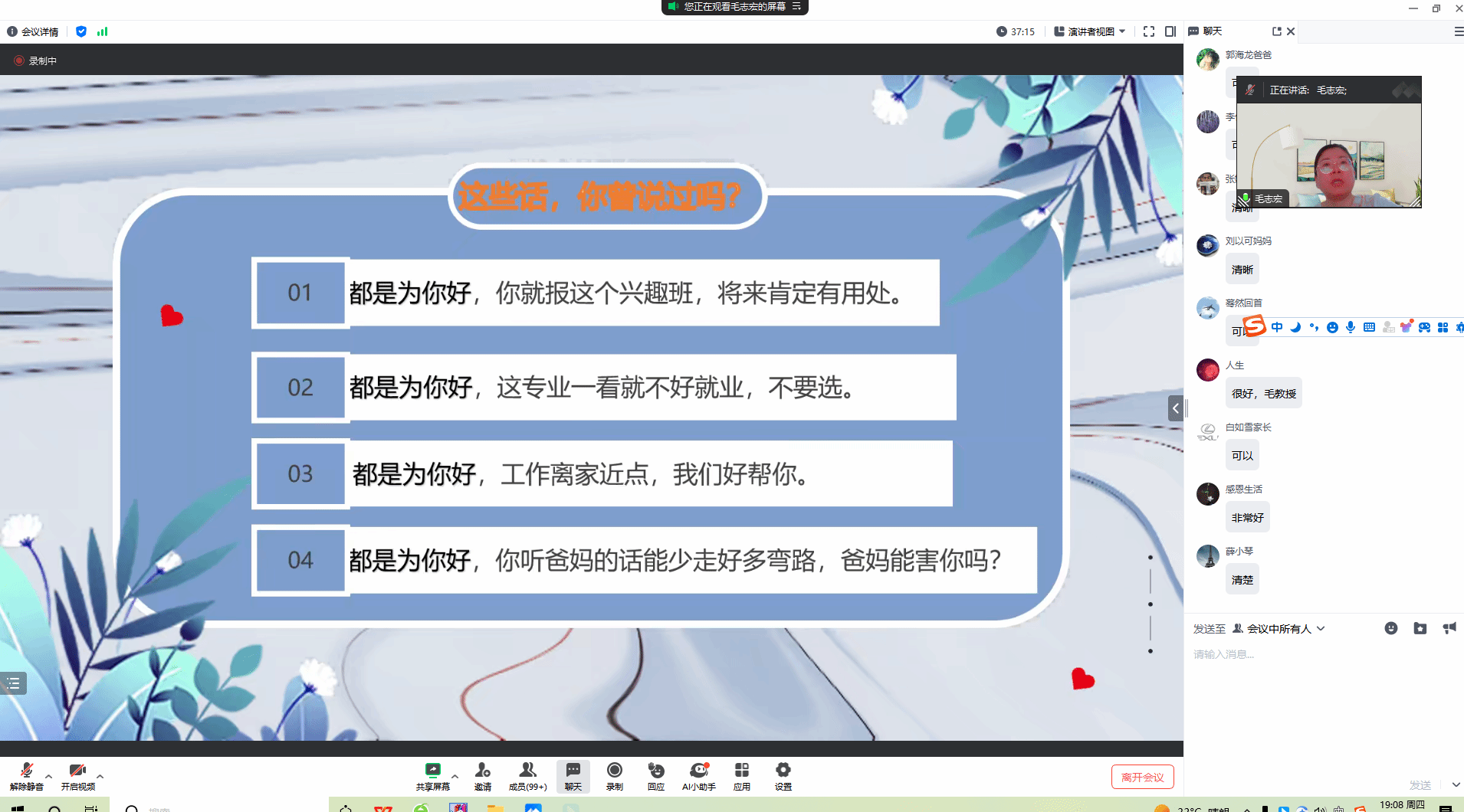 毛老师从亲子沟通中的常见问题、人际沟通的影响因素以及人际沟通的相关理论等方面,深入浅出、生动细致地向家长们进行了理论和实际案例的讲解,最后的问答环节,与家长们进行了热烈的交流与互动。