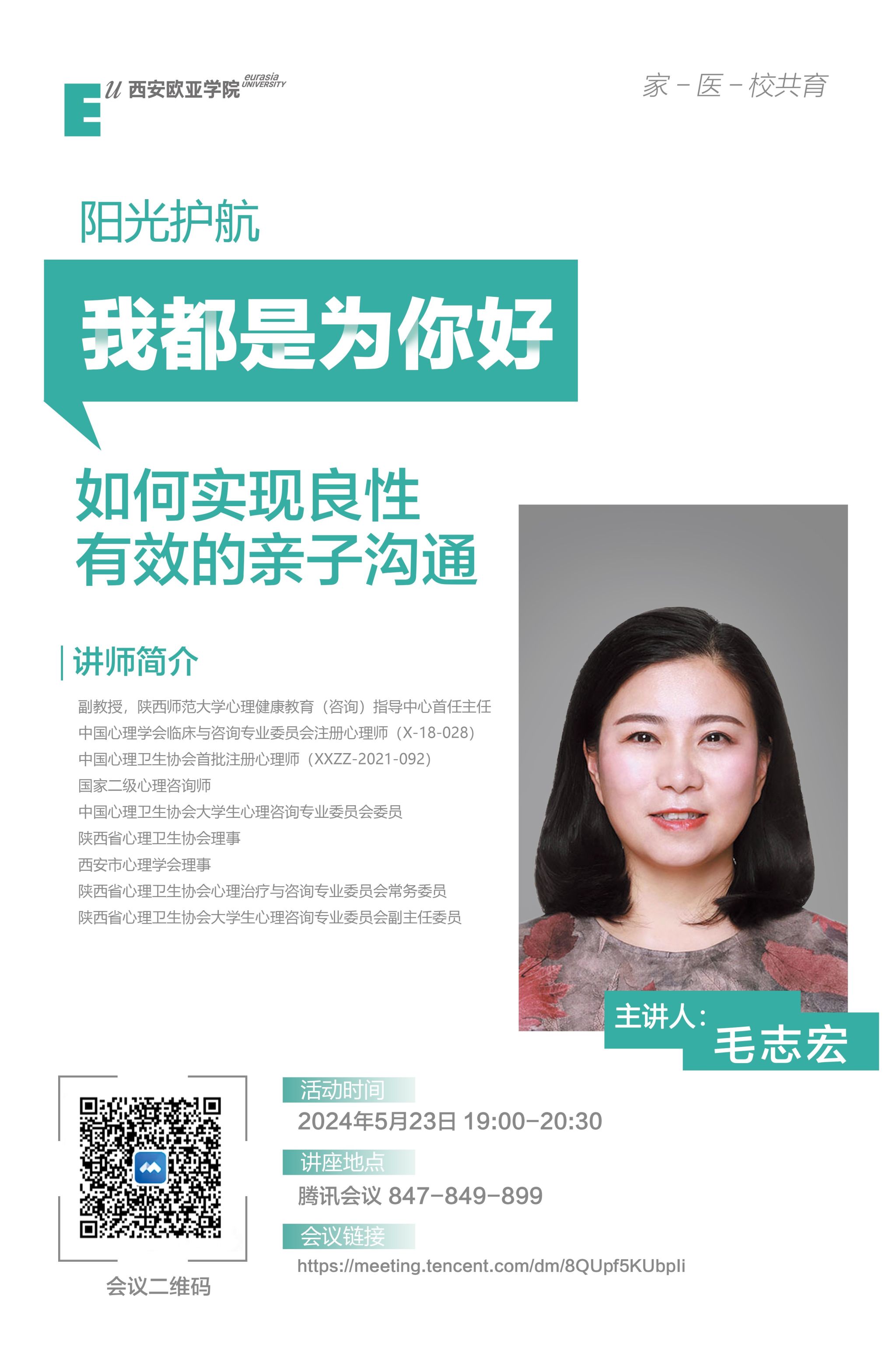 讲座最后,学生心理咨询中心老师向家长们介绍了学校各青年社区、分院学生事务中心、学生心理咨询中心的联系方式,以及“欧亚学生生活辅导”微信公众号,其中心理健康模块会推送学校心理健康相关活动、心理健康知识普及、家-医-校共育等学校心理健康工作的相关内容,便于家长了解学校心理健康工作开展情况,不断加强家庭与学校之间的联系。