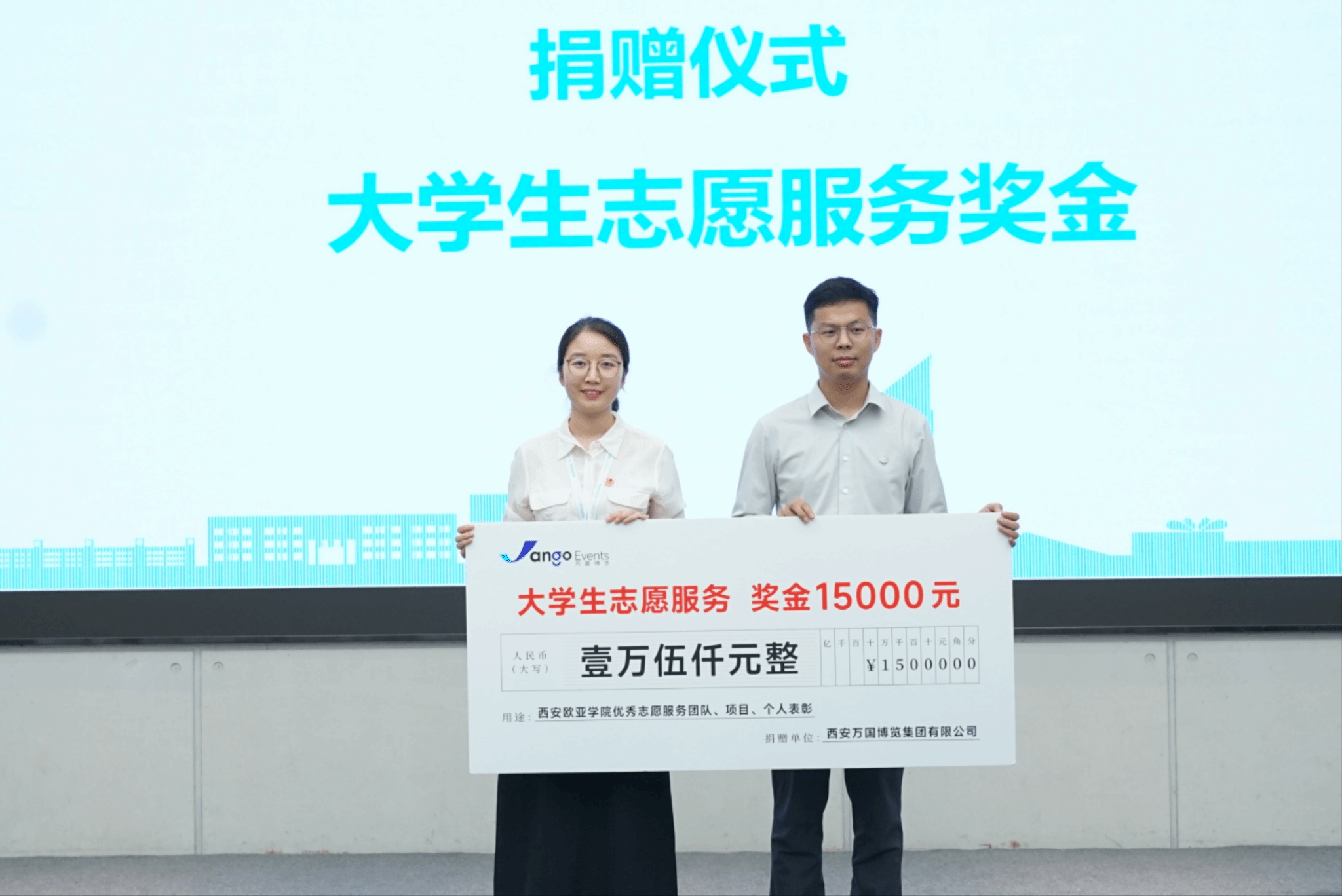 为了支持学校志愿服务工作的发展,西安万国博览集团有限公司高级项目经理田秀鹏代表公司向我校大学生志愿服务工作捐赠奖学金15000元整。我校团委副书记李艳代表学校接受捐赠。之后这笔奖金将用于学校优秀志愿服务团队、项目及个人的表彰奖励。