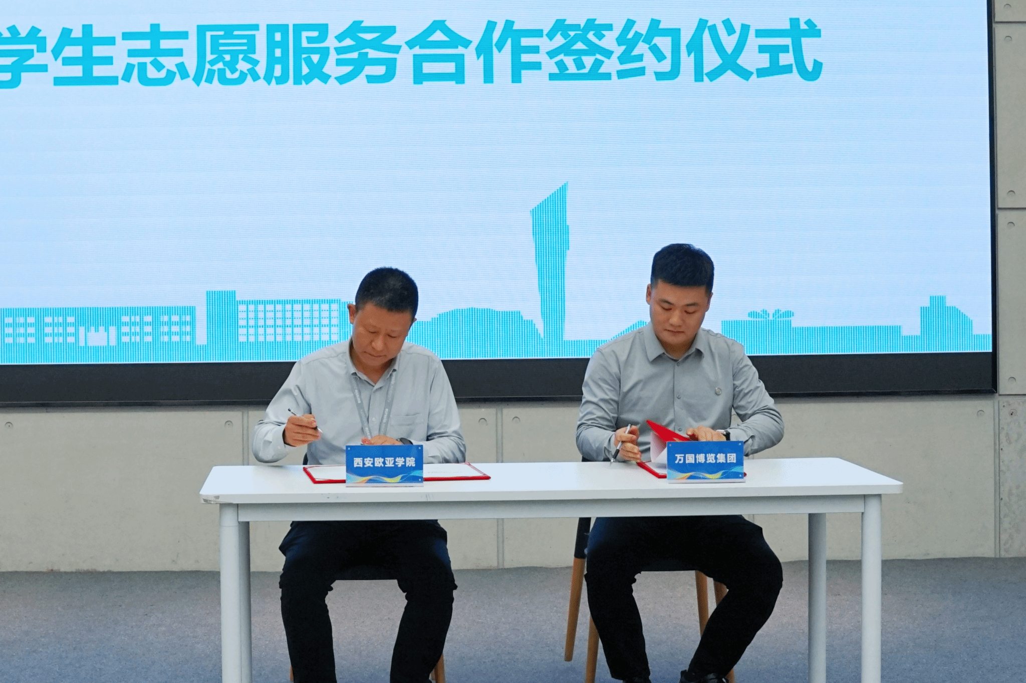接下来,学生发展处处长、校团委书记董杨与万国博览集团有限公司总经理归栋签署了大学生志愿服务合作协议。董老师代表学校向万国博览集团有限公司授“大学生志愿服务实践基地”牌,由在场全体人员见证。此次授牌有利于促进校企双方共同发挥优势,为推动社会公益事业的发展,提升我校学生志愿服务质量和学生社会实践、实训、就业提供了更加广阔的空间。
