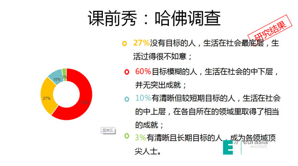 培训伊始,陈镭老师引入哈佛大学调查及研究成果,强调了目标的清晰与明确在管理中起着重要的作用。目标主要来自于愿景导向、竞争导向、顾客导向、职责导向、问题导向以及成长导向,通过目标的有效设定及实施推进才能促进组织的不断发展。