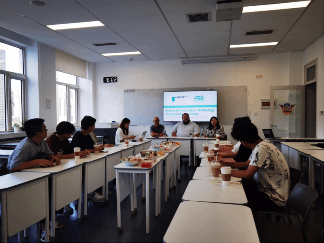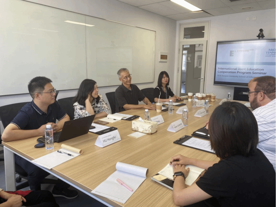 7月4日下午,西安欧亚信息工程学院与美国中田纳西州立大学合作的中外合作办学项目专业课程研讨会在信工学院4楼顺利举行。出席本次活动的嘉宾包括:西安欧亚学院副校长孙建荣教授,美国中田纳西州立大学副校长Robert Summers,亚洲学习中心主任Guanping Zheng,国际合作与交流中心主任丁洁老师,以及中美合作办学项目组徐以美老师和胡红飞老师。