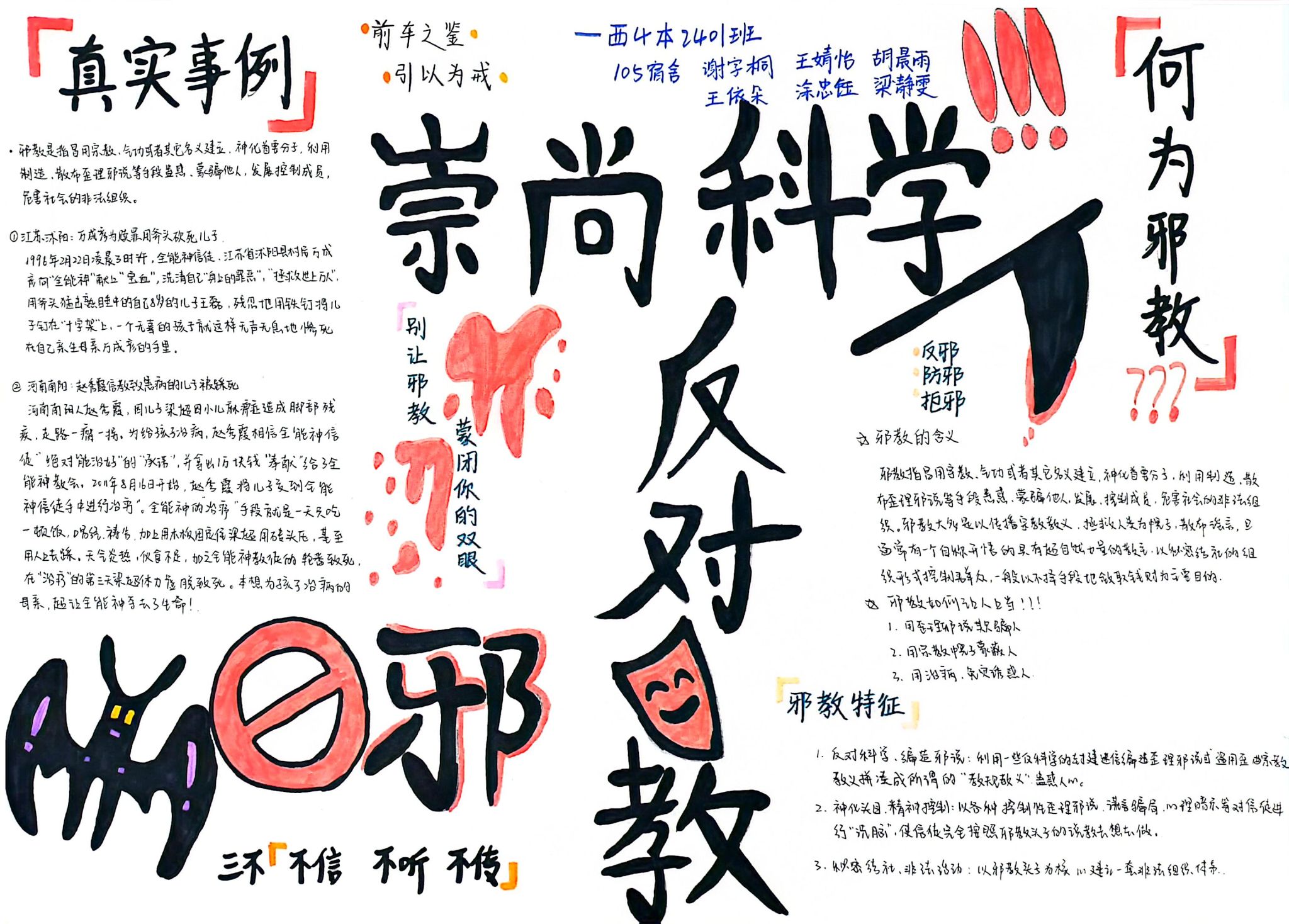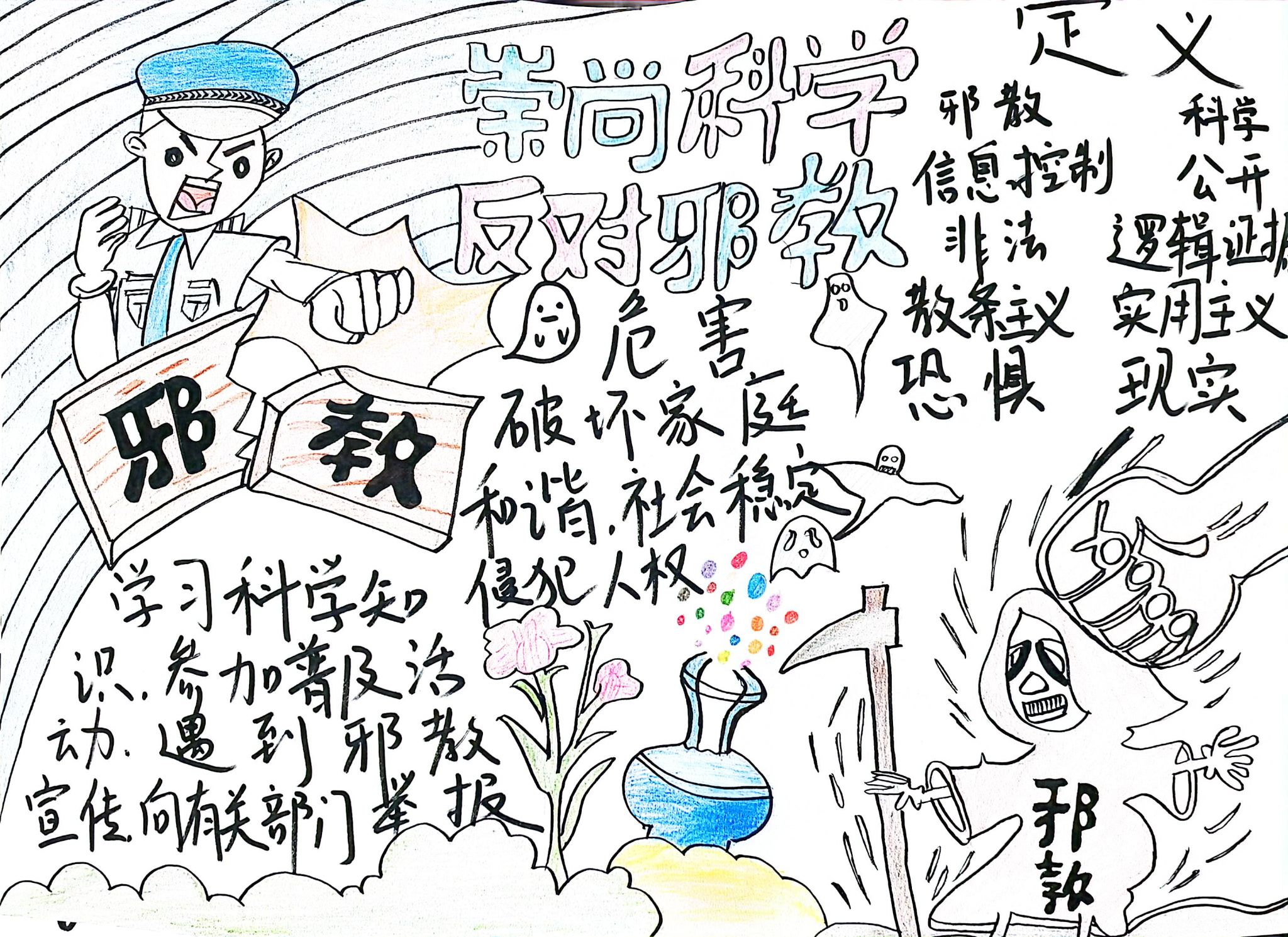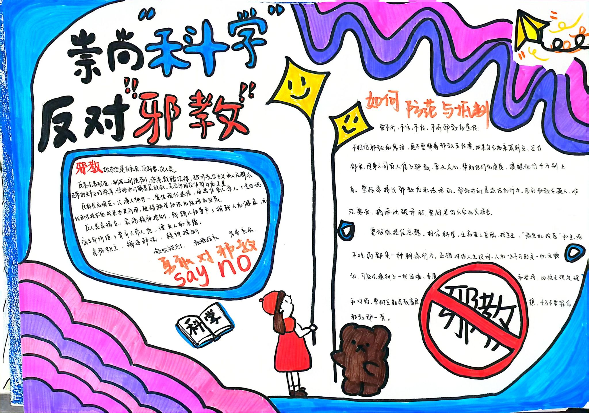 我们欣喜地看到,每一位参赛者都以饱满的热情和独到的见解,通过手抄报这一传统而富有创意的形式,传达了对邪教的坚决抵制和对科学精神的热爱。这些作品,是青春智慧的结晶,也是我们共同抵制邪教、追求真理的坚定宣言。让我们一同走进这场智慧与艺术的盛宴,感受学生们如何用画笔和文字,绘就对科学的热爱和对邪教的坚决抵制。以下是部分优秀作品的展示: