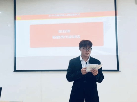 在此之后,新团员代表吴礼杰同学上台发言。作为一名新团员,他决心秉持中国共产主义青年团的宗旨,严格遵守团章,忠实履行团员义务,传承和弘扬团的优良传统。通过不懈学习和努力工作,他立志成为一位品行兼优的共青团员。在团组织的引导下,他渴望与大家携手并进,共同提升思想道德修养和多元能力,为祖国的繁荣昌盛献上自己的一份力量。
