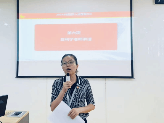 在入团仪式的尾声,白利宁老师向新团员们致以热烈的祝贺。她着重指出,新团员们应深刻领会理想、信念和纪律的核心价值。她要求,新团员们能够时刻铭记自己的入团誓言,以团员的标准自我要求,在不断的学习和实践中保持积极向上的精神风貌,将团员的先进性融入到日常言行之中,不负殷切期待,担当青春使命,为实现中华民族伟大复兴的中国梦而努力前行。最后,她期待新团员们能够践行整洁、健康、友善、自律的青年社区价值观,成为周围同学的榜样。