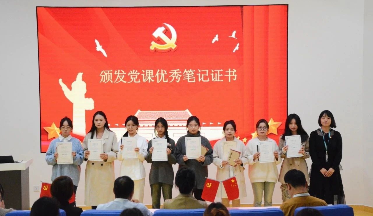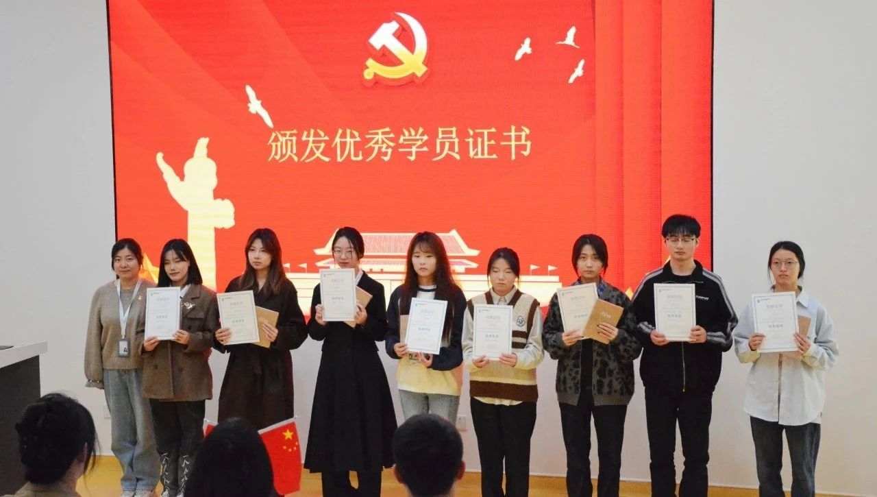 分党委统战委员曹轩豪同志宣布优秀学员名单及优秀党课笔记学生名单。根据课堂考勤、课堂表现、党课笔记及考试成绩等方面的综合考评,共评选出优秀学员8人,优秀党课笔记8人。优秀学员名单:贾梦瑶、贺思清、张嘉怡、马浩然、康乐园、许思远、李乐乐、徐可欣;优秀党课笔记学生名单:吝欣玥、史晋楠、张 婧、杜菲菲、王敏、刘慧婵、吴金怡、郭俊瑶。并现场颁发了证书。