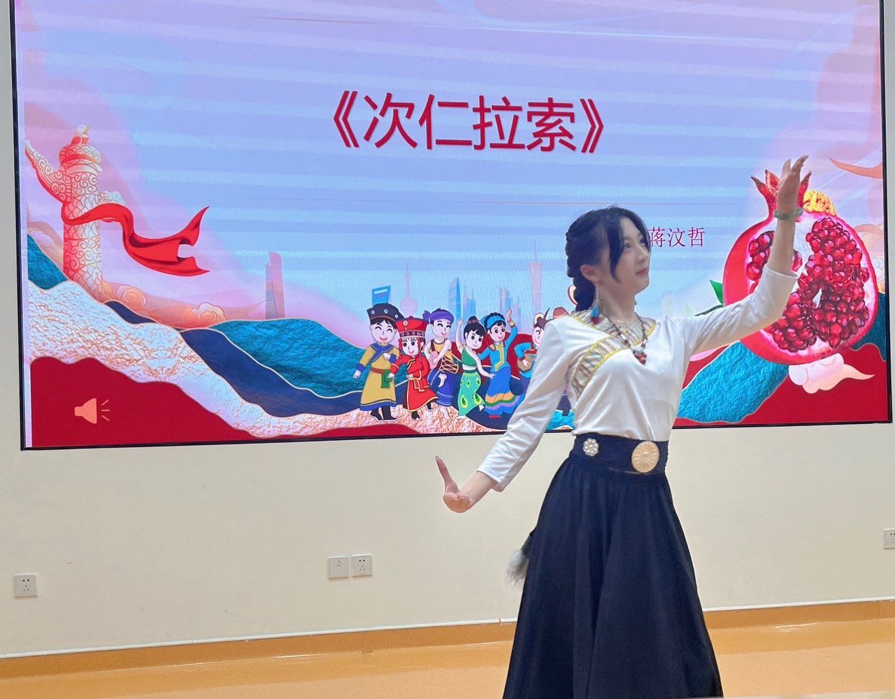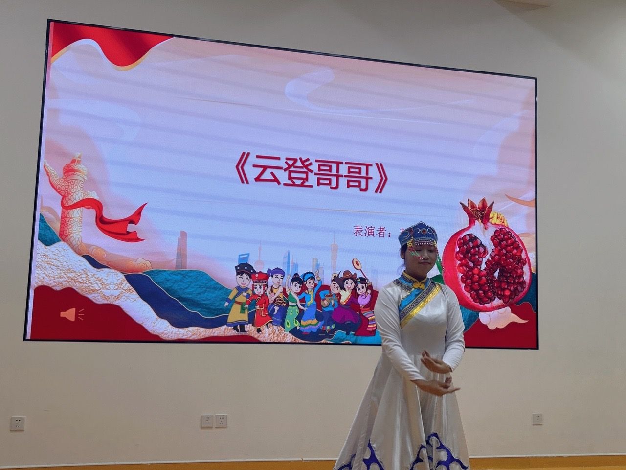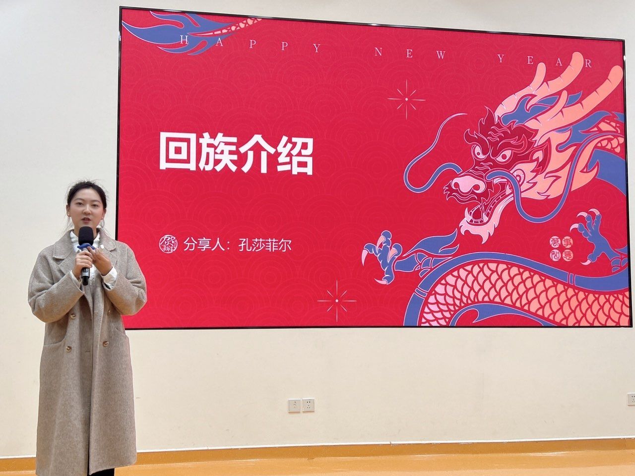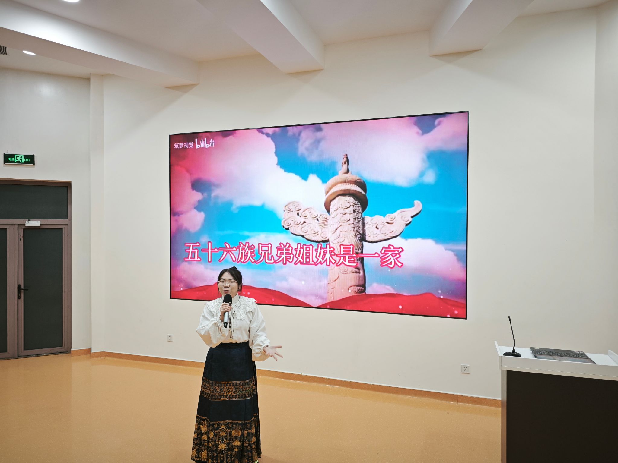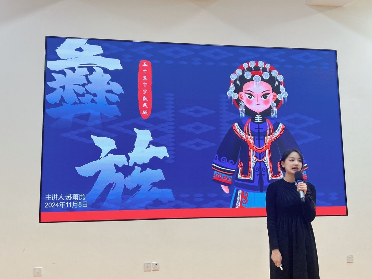 现场还有民族知识分享环节。回族同学孔莎菲尔分享了回族的文化特点和风俗习惯;彝族同学苏萧悦分享了彝族的文化、风俗和艺术魅力。新疆派驻教师陈思羽老师也现场进行了交流分享,从专业的角度讲解了民族团结在文化传承中的重要作用,引导同学们深入思考民族文化的传承与发展。