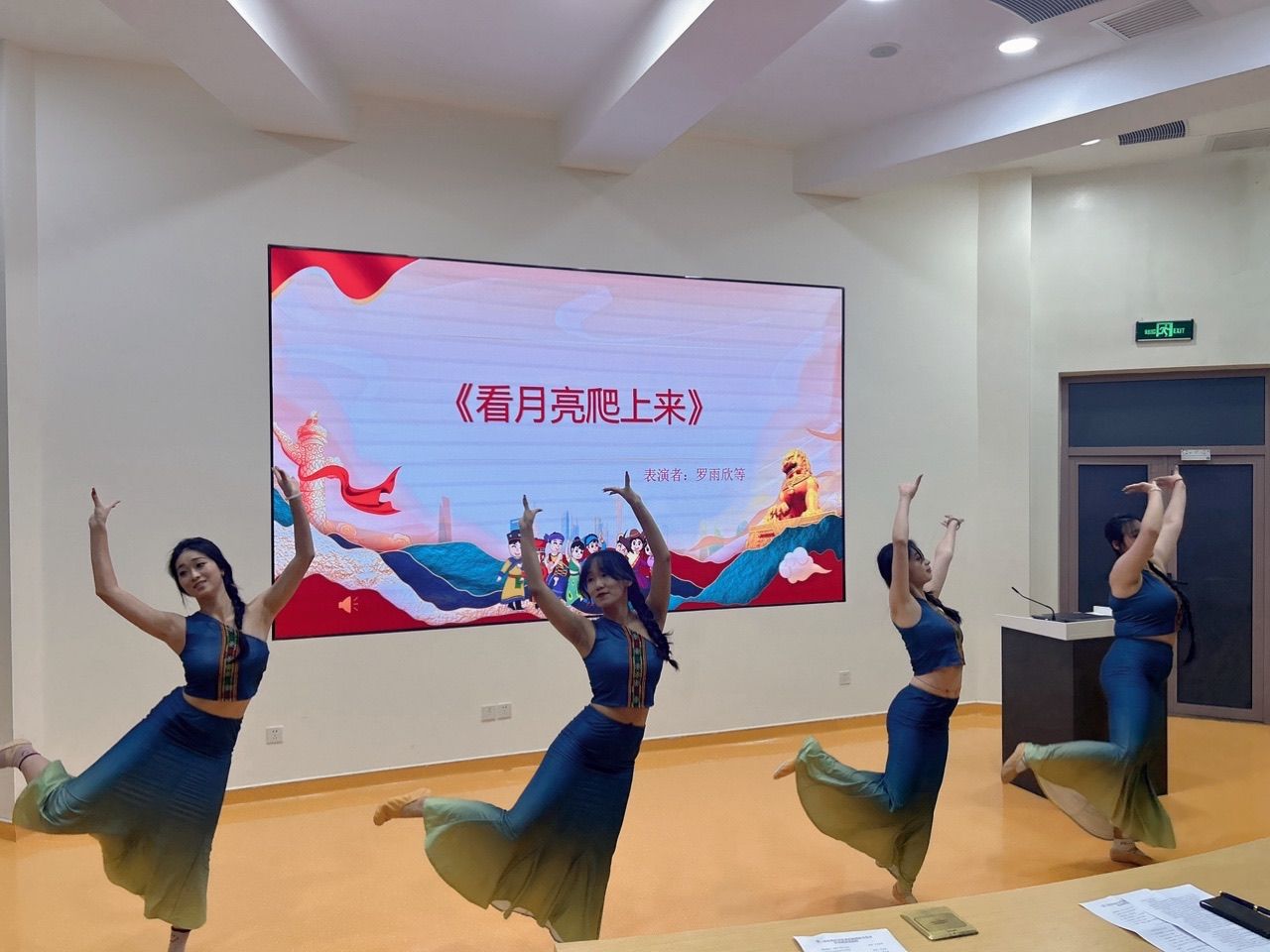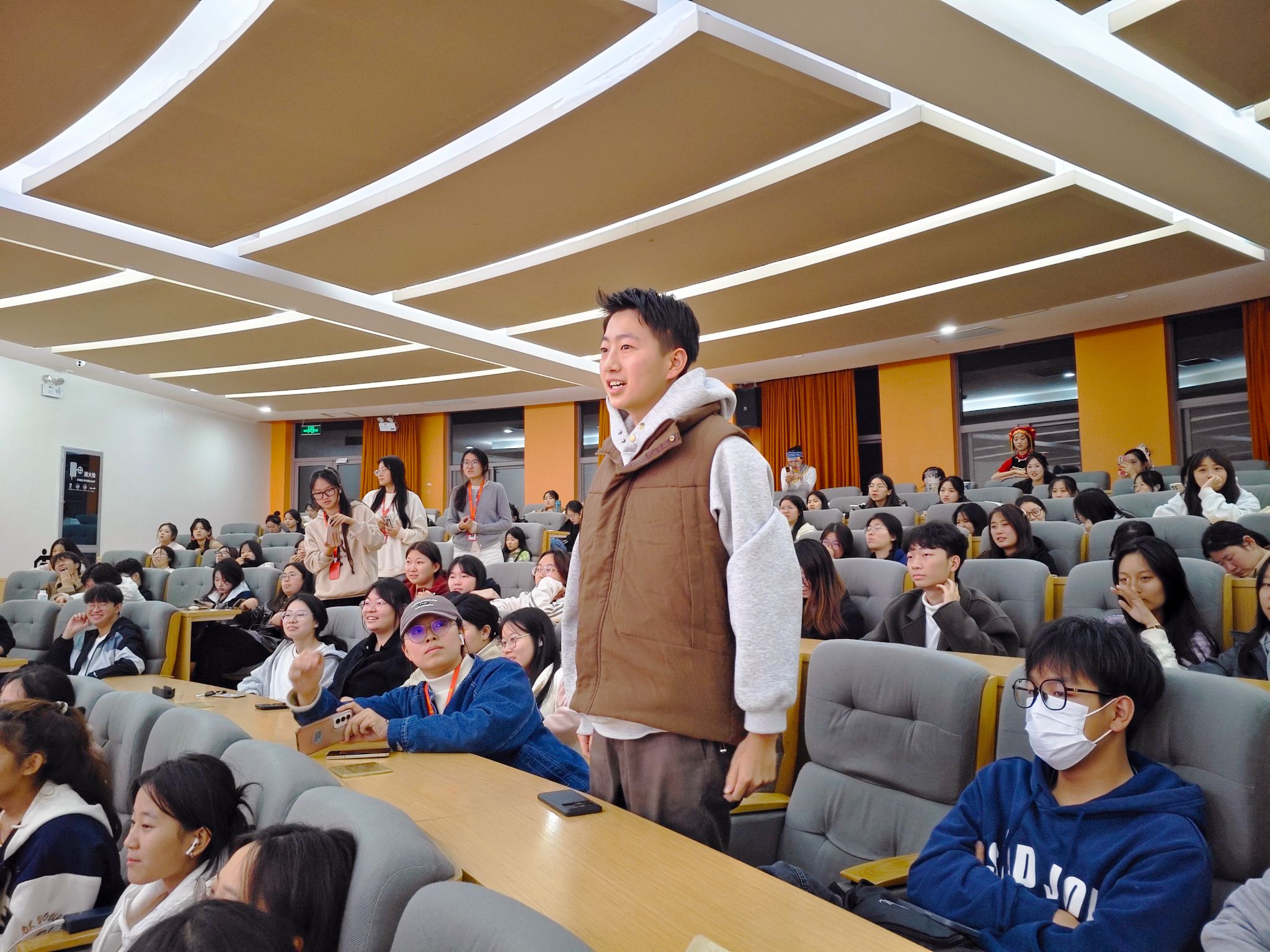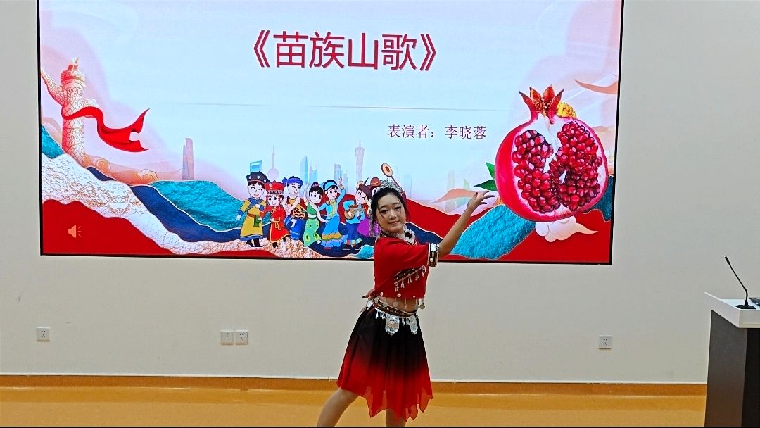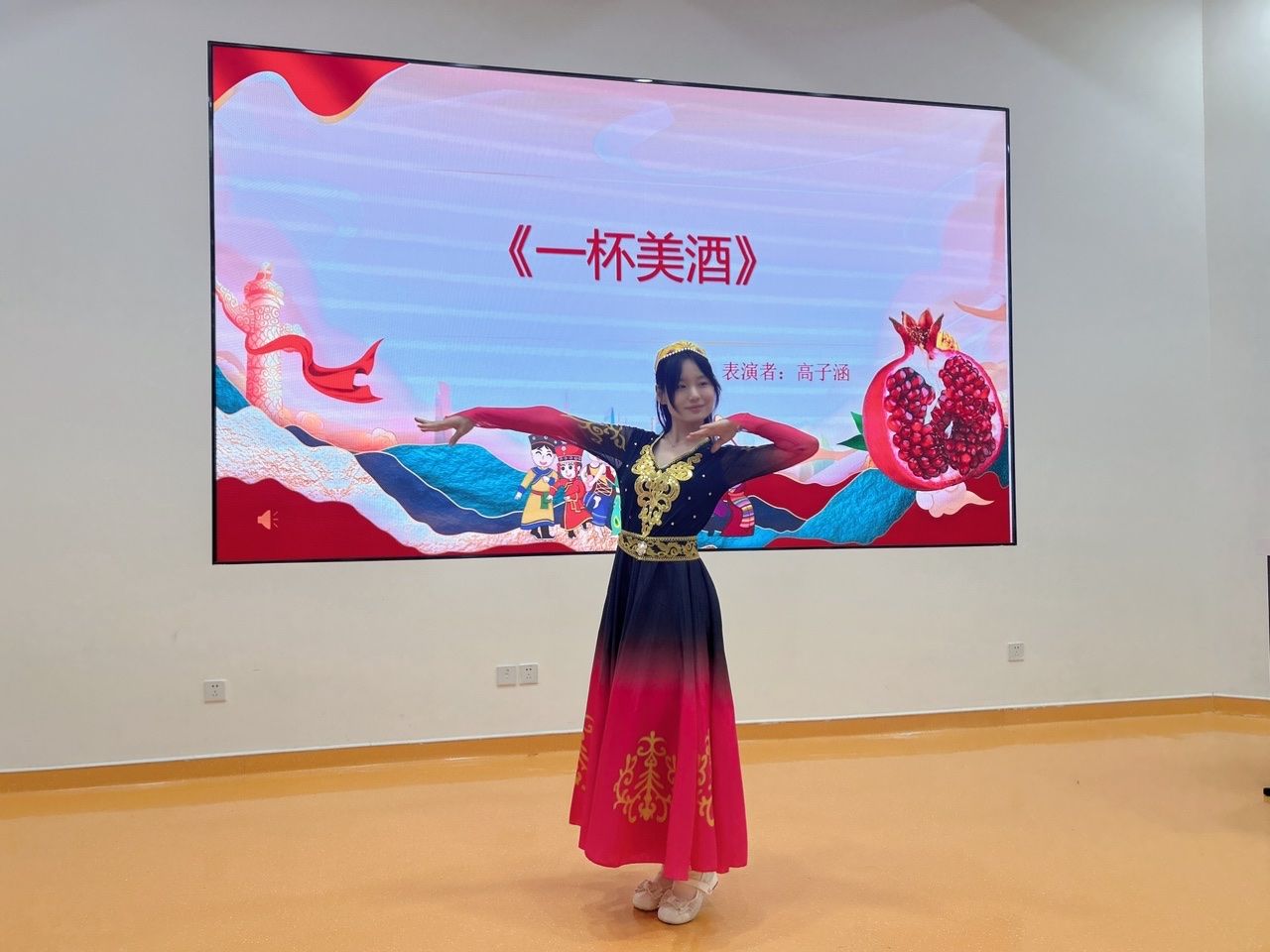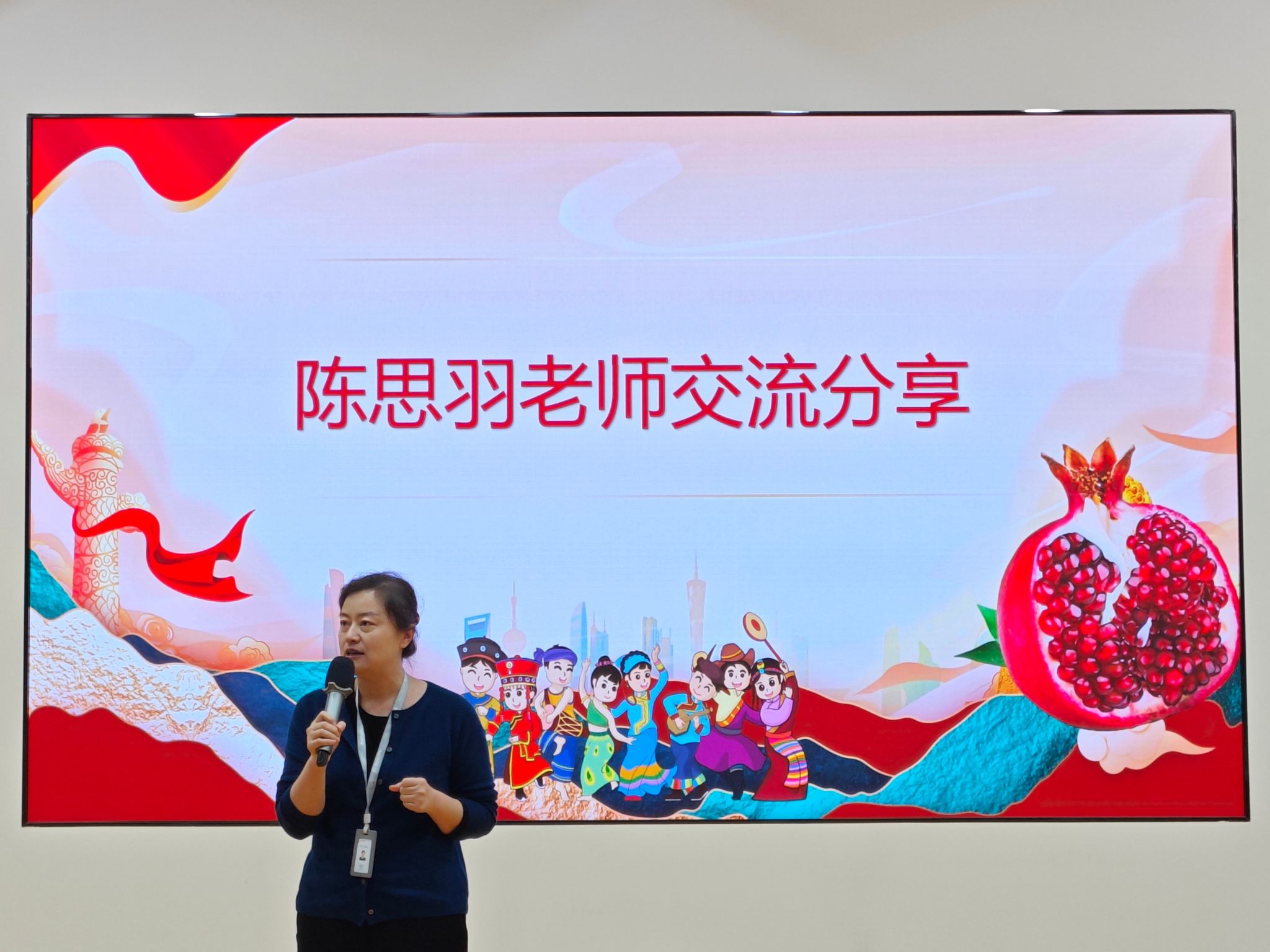现场还有民族知识分享环节。回族同学孔莎菲尔分享了回族的文化特点和风俗习惯;彝族同学苏萧悦分享了彝族的文化、风俗和艺术魅力。新疆派驻教师陈思羽老师也现场进行了交流分享,从专业的角度讲解了民族团结在文化传承中的重要作用,引导同学们深入思考民族文化的传承与发展。