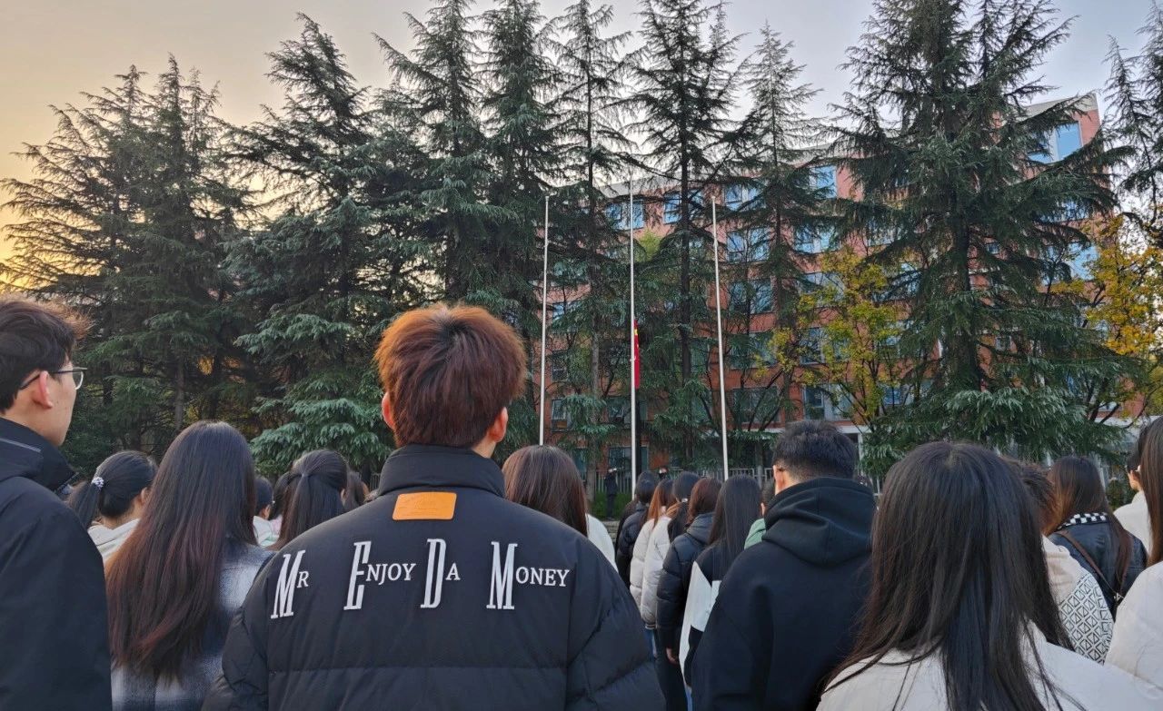 随着嘹亮的国歌声响起,五星红旗缓缓升起。在场的全体师生庄严肃立,面向国旗行注目礼,并一起合唱《义勇军进行曲》。这一刻,面向鲜艳的五星红旗,每一位在场的人心中都充满了对祖国的敬仰与自豪。作为新时代的大学生,我们怀揣着青春理想,肩负着党的期望和重托,我们要以青春之名向祖国表白,矢志不渝紧紧跟随中国共产党的步伐奔赴复兴征程。