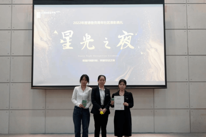 李嘉瑜老师上台发表讲话,讲述了自己的求学经历,赞扬德鲁克社区组织能力强,社区学子的精神面貌佳。她说:我们通过社区的非正式教育,我们学会了自我管理、团队管理,拥有了管理的DNA,并带着这样的DNA扬帆起航。最终获得了属于自己的星光。所以,你们是闪耀的星辰之光,为德鲁克青年社区增添了绚丽的色彩!