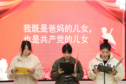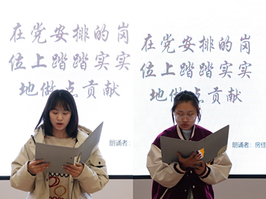 肖羽、王理玉、李文静同学朗诵的是《我既是爸妈的儿女,也是共产党的儿女》,这是年轻的基层干部谢燕2020年1月29日在疫情一线写给母亲的一封家书。在信中,她向家人介绍了她负责疫情防控的主要工作,虽然工作艰辛,但她丝毫没有感到辛苦,反而表达了她在工作中收获了幸福和感动。她说,“幸福是因为和领导、同事们一起并肩作战,众志成城,共同抗击病疫,让我明白了忙碌的意义”。她还安慰家人不要担心,她不辛苦也不累,因为她不仅是爸妈的女儿,也是共产党的女儿。