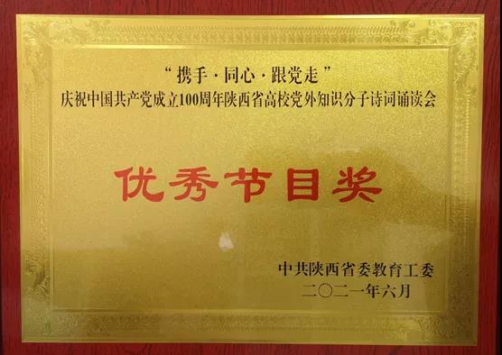经过展演,我校诗词朗诵节目《没有共产党就没有新中国》得到中共陕西省委教育工委和其他学校的认可和好评,获得“携手•同心•跟党走”庆祝中国共产党成立100周年陕西省高校党外知识分子诗词诵读会“优秀节目奖”。