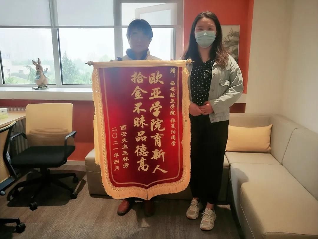 2021年4月22日,一面锦旗送到了西安欧亚学院人文教育学院。锦旗上写着“欧亚学院育新人 拾金不昧品德高”,是日前丢失了两万元现金的失主王林芳,为表达对张夏阳同学的感谢而特别定做。