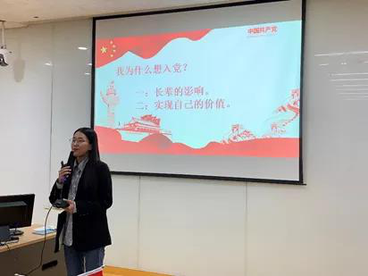 董诗琦同学带来的主题是《寻找初心,我为什么要入党》,从受长辈的影响和实现自己的价值两个方面引出了自己的主题,讲述自己从小受父亲耳濡目染的影响,红色基因的种子从小就在心里种下,共产党对于她来说一直是一个梦寐以求加入的组织。真情实感溢于言表。
