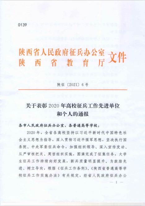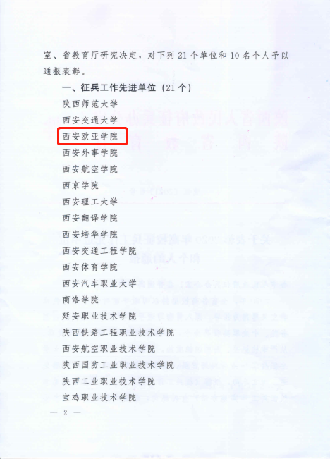 近日,陕西省人民政府征兵办公室、陕西省教育厅联合下发《关于表彰2020年高校征兵工作先进单位和个人通报》(陕征〔2021〕6号),西安欧亚学院荣获“2020年陕西省高校征兵工作先进单位”,这是我校连续三年获此殊荣。在西安市雁塔区党管武装工作述职暨国防动员委员会会议上,因征兵工作突出,雁塔区国防动员委员会授予我校“2020年度征兵工作先进单位”,西安欧亚学院连续六年获“年度征兵工作先进单位”荣誉称号。