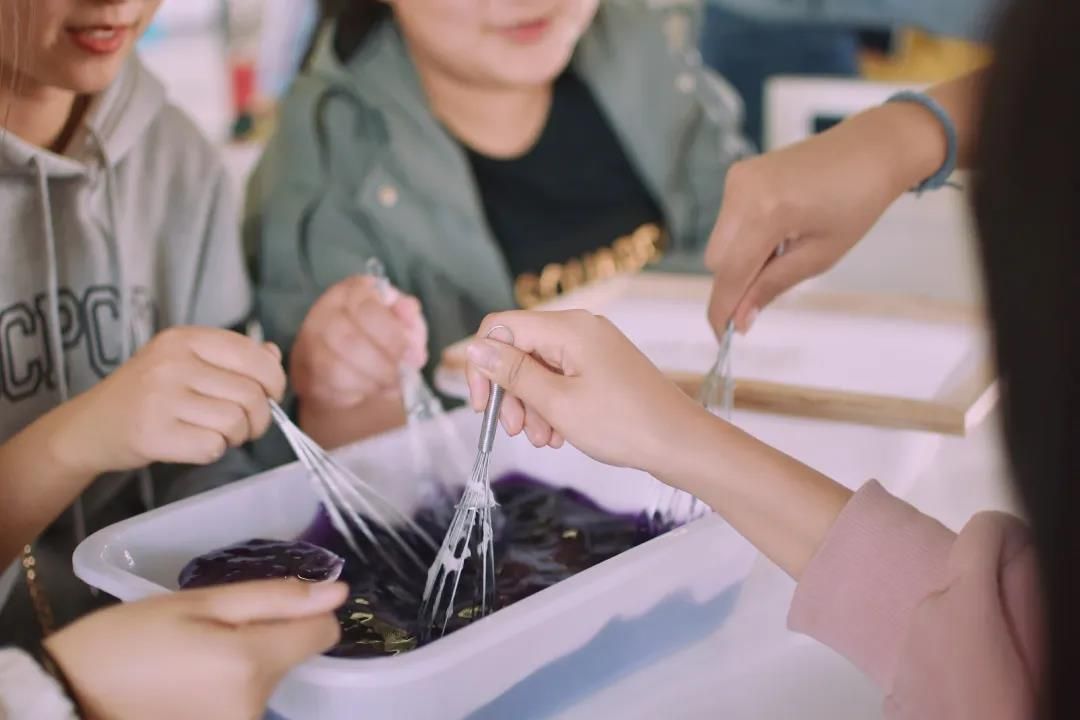 同学们个个乐此不疲,兴趣盎然。专注的神情、小心翼翼的动作,好像生怕吵醒了正在凝固的奇特纸张。同学们兴奋地交谈着、欣赏着,感受着传统文化的魅力。一起来感受制作过程吧!