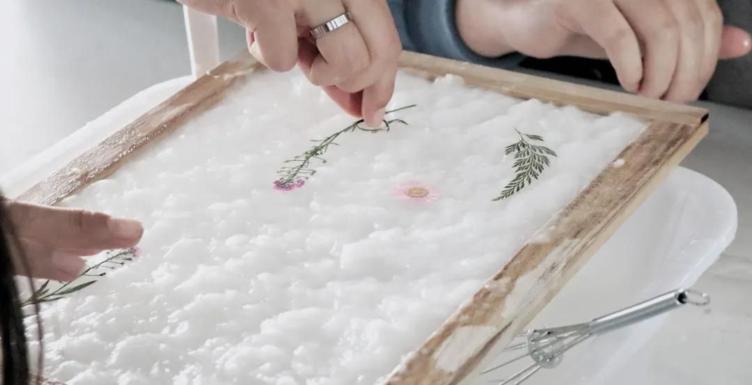 从一池花粥中捞出一张张婀娜的纸张,再将纸浆放入造纸框上,进行脱水、装饰、晾干。
