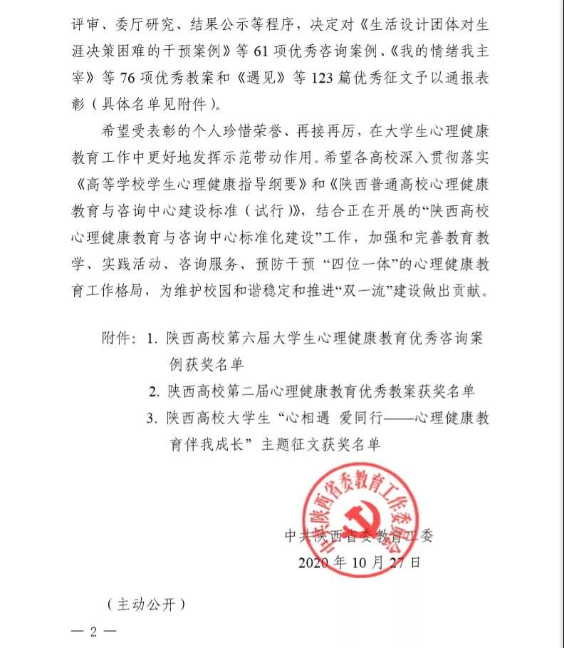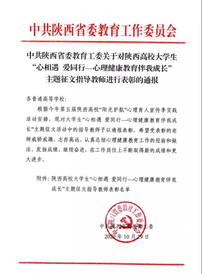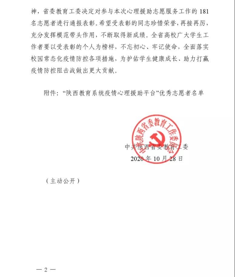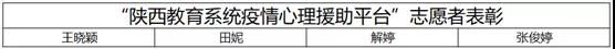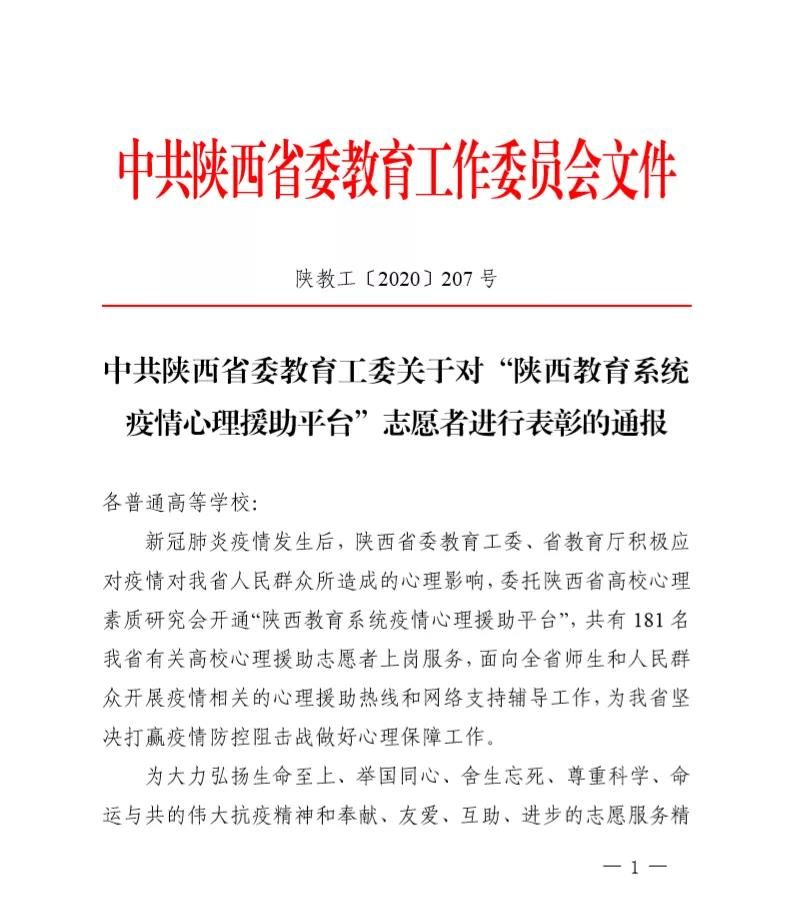 新冠肺炎疫情发生后,陕西省委教育工委、省教育厅积极应对疫情对我省人民群众所造成的心理影响,委托陕西省高校心理素质研究会开通“陕西教育系统疫情心理援助平台“,欧亚工作者也积极行动,用心理援助志愿服务拂去疫情阴霾、纾解负面情绪,帮助求助者找回心“晴”。近日,省委教育工委决定对参与本次心理援助志愿服务工作的 181名志愿者进行通报表彰,其中西安欧亚学院心理咨询中心王晓颖老师、张俊婷老师,社区辅导员田妮老师、解婷老师榜上有名。