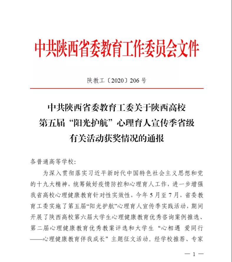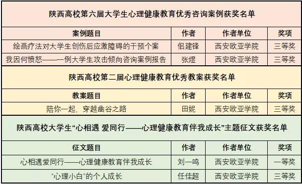 2020年5月至7月,省委教育工委实施了第五届“阳光护航”心理育人宣传季实践活动,期间开展了陕西高校第六届大学生心理健康教育优秀咨询案例推选、第二届心理健康教育优秀教案评选和大学生“心相遇 爱同行——心理健康教育伴我成长”主题征文活动,欧亚在本次宣传季活动中成绩斐然,共斩获五个奖项。