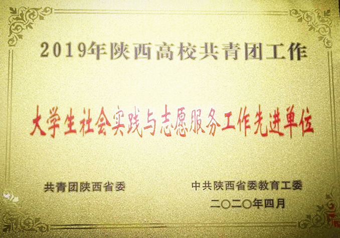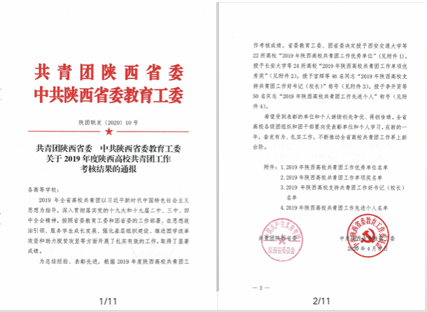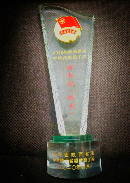 近日,共青团陕西省委、中共陕西省委教育工委联合下发了《关于2019年度陕西高校共青团工作考核结果的通报》(陕团联发〔2020〕10号),我校团委获得“陕西高校共青团大学生社会实践与志愿服务工作先进单位”,校长刘瑾教授荣获“2019年陕西高校支持共青团工作好校长”称号。