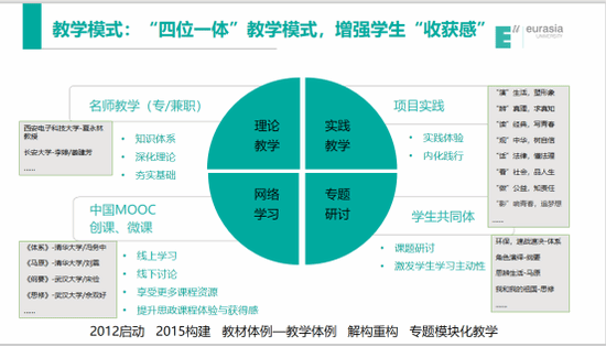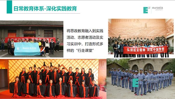 同时,西安欧亚学院结合学生实际特点和需求,重构思政课教学内容,开展专题模块化教学,从以前的“满堂灌”转变为学生自发的“我要学”,开展多种形式的实践活动,使学生完成“学习参与”到“实践体验”直至“内化践行”的完整学习目标。这些改革成果也获得外部的一致认可,中国教育报于2017年5月24日以“让抽象的理论知识生动起来”为题对西安欧亚学院思政课改革做了专题报道。下一步,学校将持续发挥信息化的优势和所处地理位置的优势,线上线下相结合、理论与实践相结合,为学生提供更多种形式的学习机会。