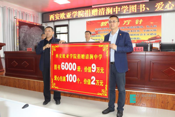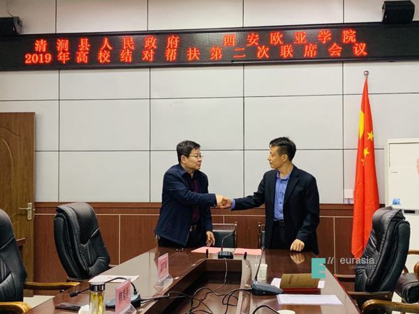 6、2019年4月25日,校党委书记于孟晨带队参加清涧县召开的“双百工程”联席会议,清涧县高明伟县长、韩秀晋副县长等出席了会议。我校工会副主席晏建忠与清涧县韩秀晋副县长分别代表学校和县政府签订了《西安欧亚学院与清涧县2019年教育帮扶协议》;我校文化传媒学院党总支书记左伟介绍了产学研合作项目落地方案;会议讨论了2019年帮扶工作机制,确定了教育局惠东平副局长为西安欧亚学院教育帮扶协调人。