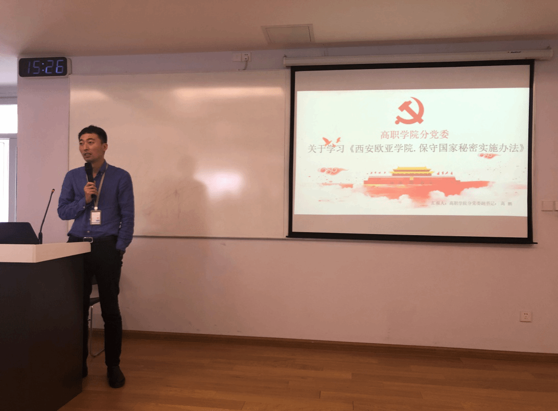 一直以来,保守国家的秘密是一项重要而艰巨的工作。为更好的学习《保密法》,2019年5月31日,由高职学院分党委副书记高鹏同志带领全体党员教师,学习了《西安欧亚学院保守国家秘密实施办法》。