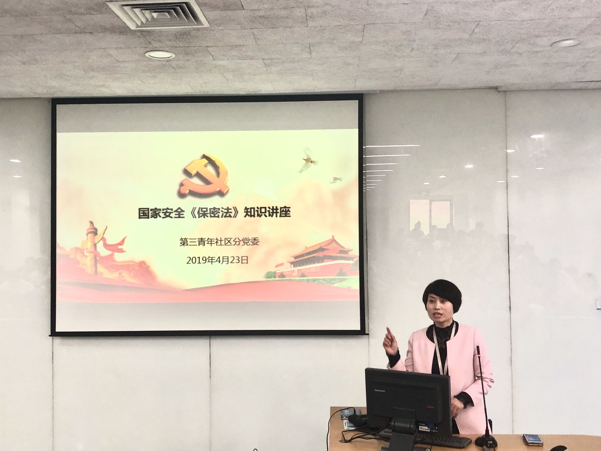 4月23日晚,第三青年社区分党委副书记张爱荣同志为本期入党积极分子培训班带来《中华人民共和国保守国家秘密法》的党课学习。张爱荣老师从总则、国家保密法的范围和密级、保密制度、监督管理和法律责任等五个方面展开讲解,同时联系到目前在校大学生的学习状况和思想实际,对同学们的思维模式、行为方式进行了正确引导。在整个党课期间,根据《保密法》的内容,张老师还实时插播了四个小视频,帮助同学们更加形象直观地了解并学习保密法知识。