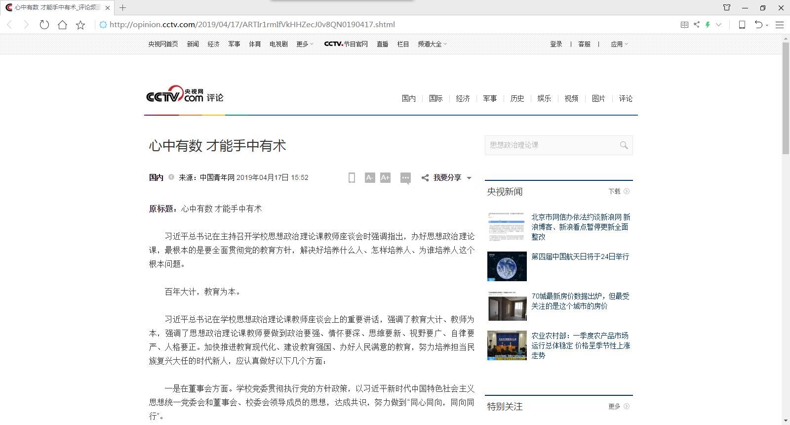 (图二)央视网转载西安欧亚学院党委书记于孟晨同志在《中国青年报》发表《心中有数 才能手中有术》文章截图
