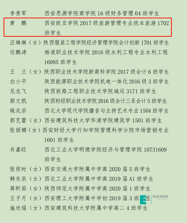 近期,共青团陕西省委下发了《共青团陕西省委关于表彰2018年度“陕西省优秀共青团员”、“陕西省优秀共青团干部”及“陕西省五四红旗团支部”、“陕西省五四红旗团委”、“陕西省团建先进县”的决定》(陕团发[2018]14号)的文件,对2018年全省各级团组织的共青团工作进行了总结表彰。我校荣获陕西省共青团工作的最高荣誉——“陕西省五四红旗团委”荣誉称号,学校青年志愿者协会黄鹏同学(统本旅游1702班)荣获2018年度“陕西省优秀共青团员”称号。