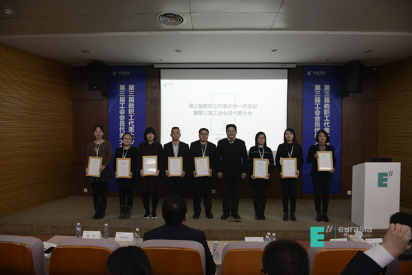 于孟晨书记、陈鹏副主席和刘瑾校长分别为2018年工会绩效工作优秀、良好分会、工会小组和2018年工会示范性分会获得者颁奖。