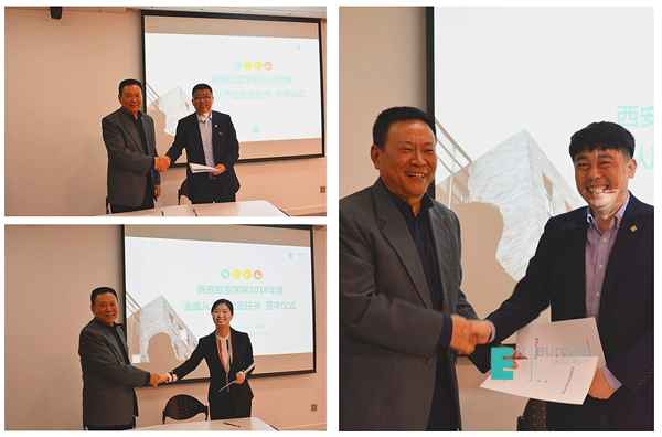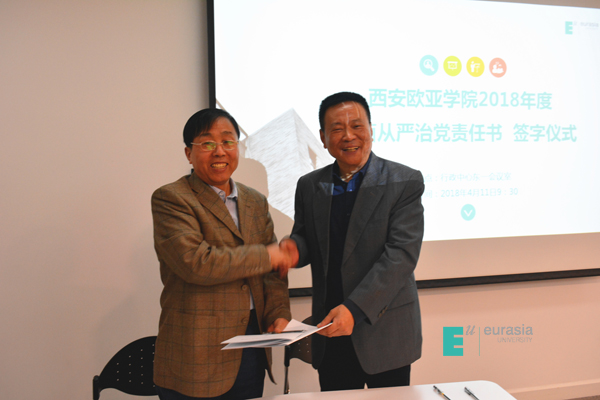 (图二)许尚年书记代表校党委与校纪委书记王志强签订《西安欧亚学院2018年全面从严治党责任书》