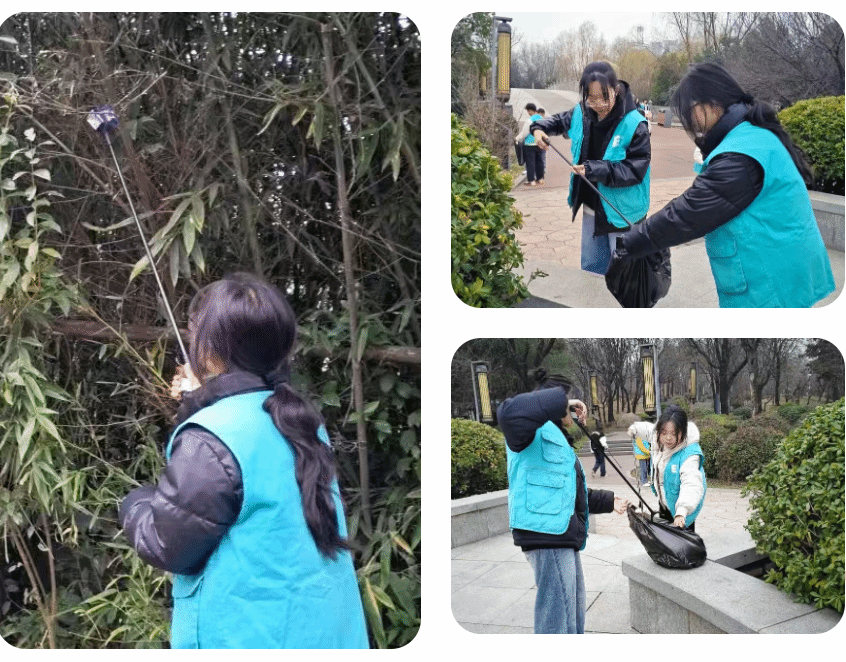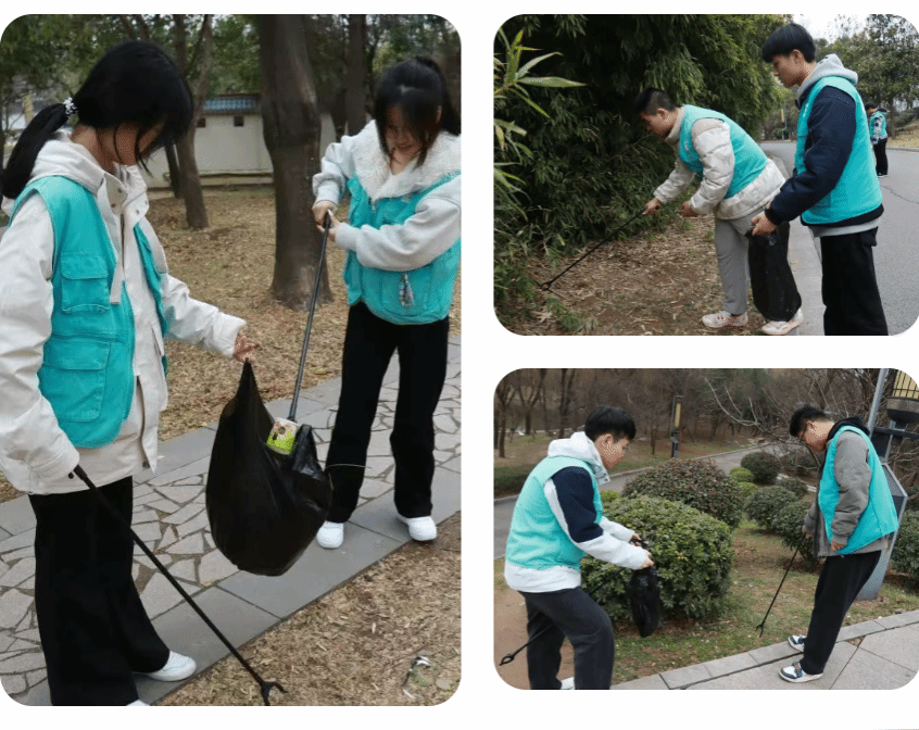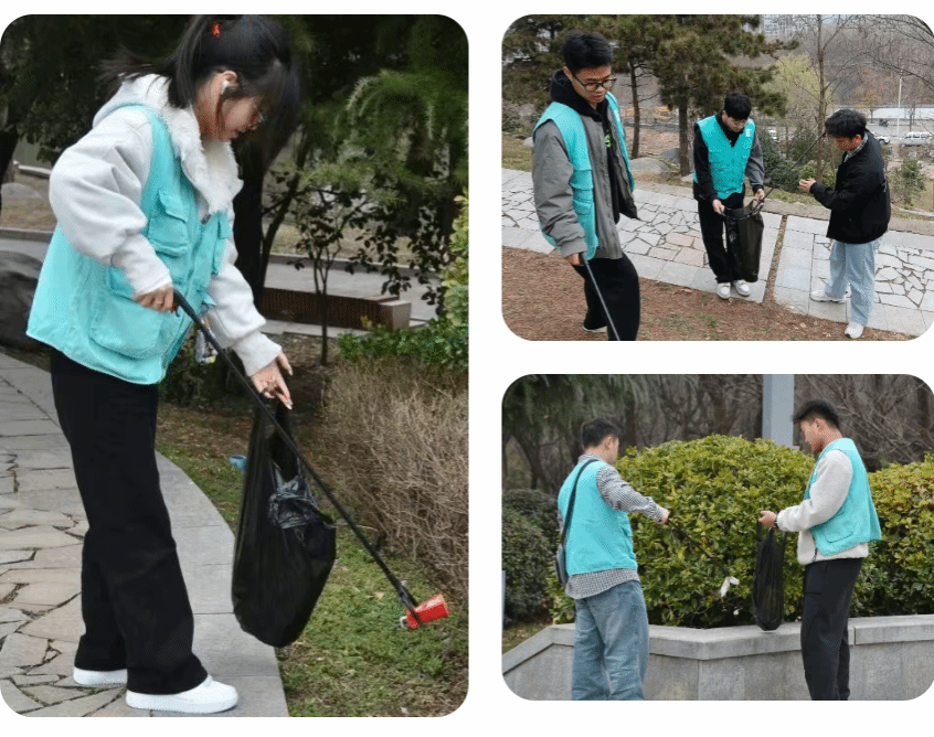 他们或弯腰捡拾散落在步道旁的烟蒂、纸屑,或细心清理湖边漂浮的塑料瓶、食品包装袋。有的同学两两组队,有的同学自力更生,沿着路边、顺着山坡、绕着绿化带等各个地方,认真仔细的清理着里面的垃圾,用实际行动践行“绿水青山就是金山银山”的环保理念。