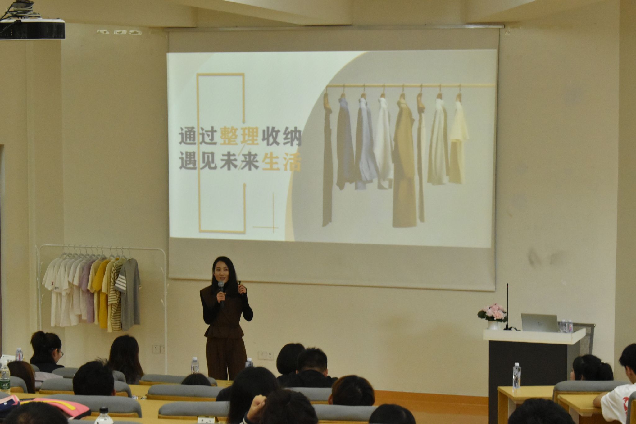 刘蓓老师从整理行业背景、整理思维与收纳呈现、整理对生活的改变和“宿”说美好生活四个方面进行讲解。阐述了在收纳物品时要用到断舍离的方式,一些常年搁置的旧物,已经失去实用价值,我们可以适当放弃,简约、明快的生活方式更让人放松。讲座现场,同学们积极参与互动,讲述自己的整理思路与收纳心得。