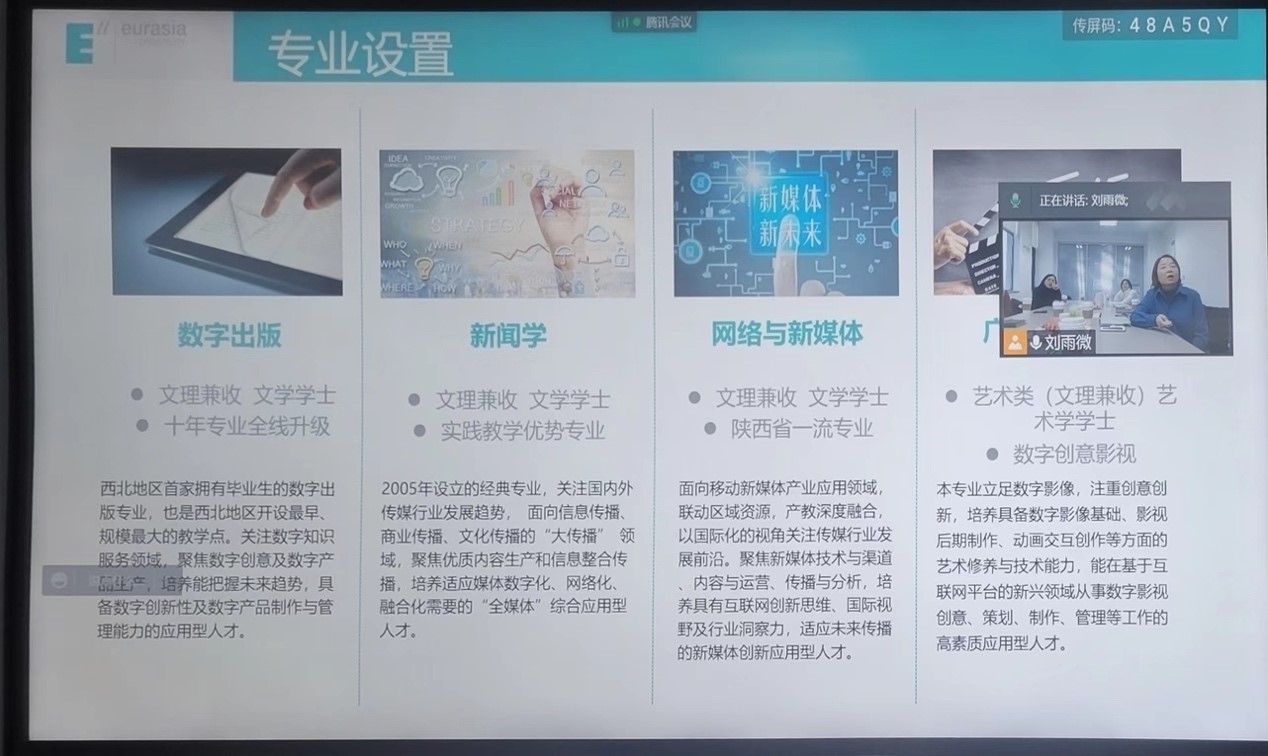 文化传媒学院“校友沙龙”交流活动聚焦于杰出的毕业及在校校友,以自由开放的沙龙交流会形式,分享优秀校友的就业创业心得、深造求学经历等,塑造榜样力量,构建“走出文传,反哺文传”的良性循环体系,搭建有效沟通的纵向“传帮带”平台。与此同时,也借此机会加强校友联络,凝聚校友力量,发扬校友精神,增强校友归属感,共同深化产教融合,推进欧亚开放办学。