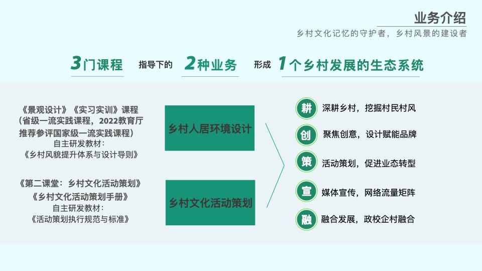 基于该课程实践,今年艾德艺术设计学院王瑛、黑慧越等老师指导,邓诗曼同学负责的“我为乡村种‘⻛景’——乡村文化记忆守护者”项目夺得“青年红色筑梦之旅”赛道金奖。项目团队参与学⽣超过100⼈,共服务20多个⾏政村和40多个⾃然村,规划设计⾯积超 5000 亩,吸引投资超过1.2亿元,受益村⺠超过2万⼈。