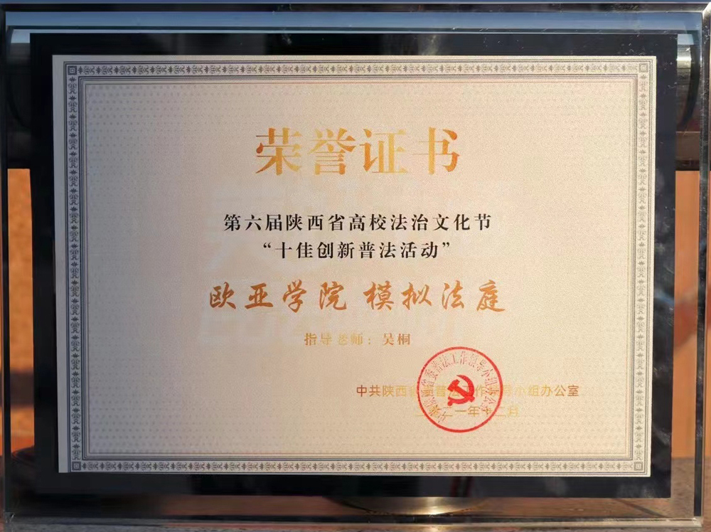 2021年12月1日,第六届陕西省高校法治文化节成果汇报会在西北政法大学举行,我校模拟法庭活动获评“十佳创新普法活动”。Ivy社区分团委书记吴桐获“优秀指导教师”荣誉称号。第四青年社区分党委书记李嘉瑜现场进行了经验分享。