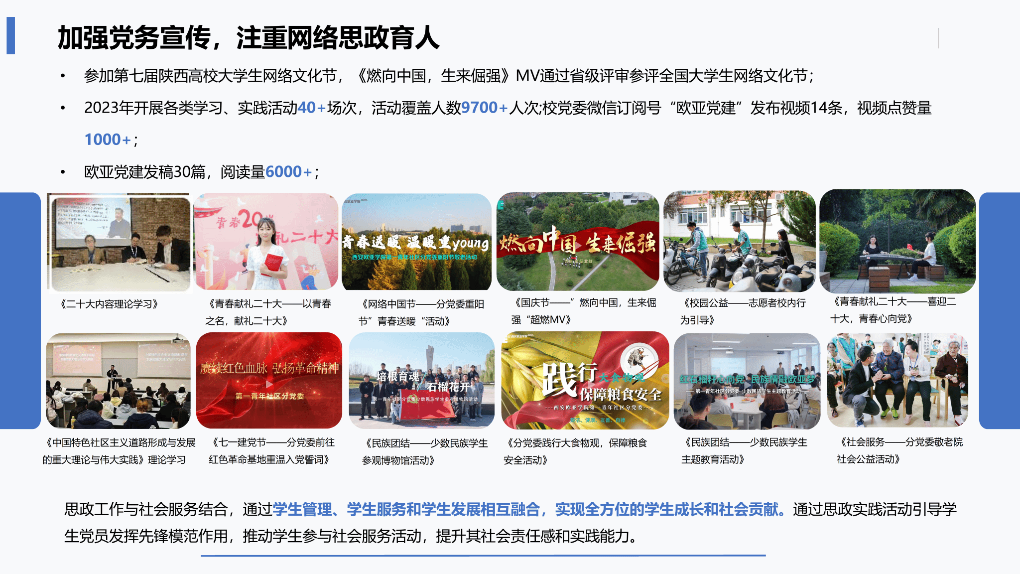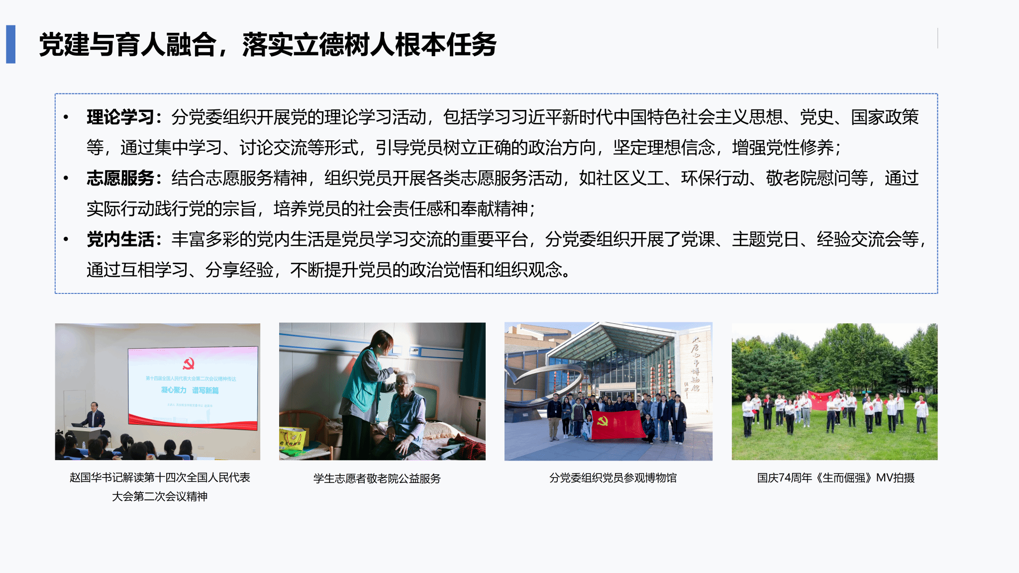 思政工作与社会服务结合,通过学生管理、学生服务和学生发展相互融合,实现全方位的学生成长和社会贡献。通过思政实践活动引导学生党员发挥先锋模范作用,推动学生参与社会服务活动,提升其社会责任感和实践能力。