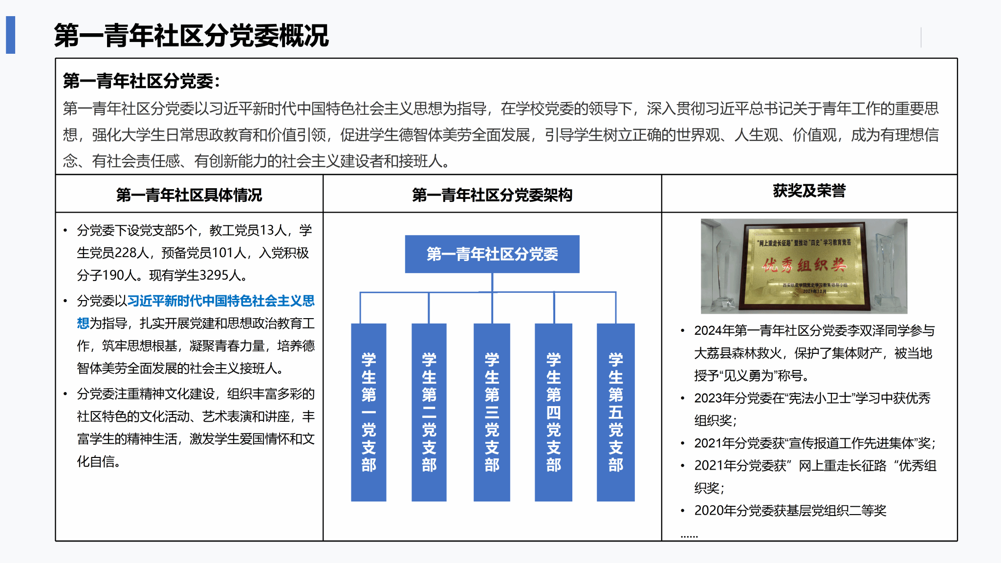 第一青年社区分党委以习近平新时代中国特色社会主义思想为指导,在学校党委的领导下,深入贯彻习近平总书记关于青年工作的重要思想,强化大学生日常思政教育和价值引领,促进学生德智体美劳全面发展,引导学生树立正确的世界观、人生观、价值观,成为有理想信念、有社会责任感、有创新能力的社会主义建设者和接班人。