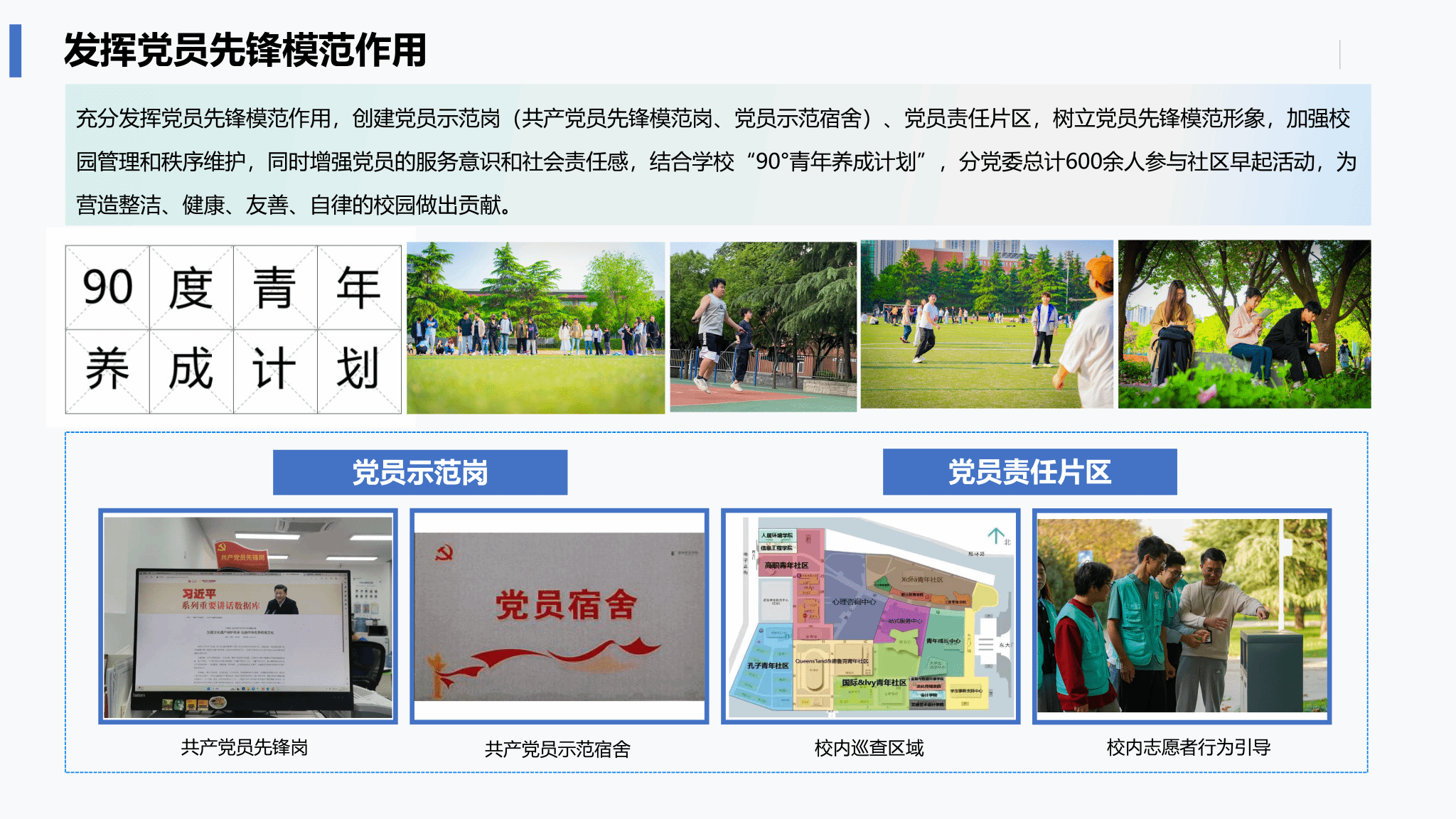 充分发挥党员先锋模范作用,创建党员示范岗(共产党员先锋模范岗、党员示范宿舍)、党员责任片区,树立党员先锋模范形象,加强校园管理和秩序维护,同时增强党员的服务意识和社会责任感,结合学校“90°青年养成计划”,分党委总计600余人参与社区早起活动,为营造整洁、健康、友善、自律的校园做出贡献。