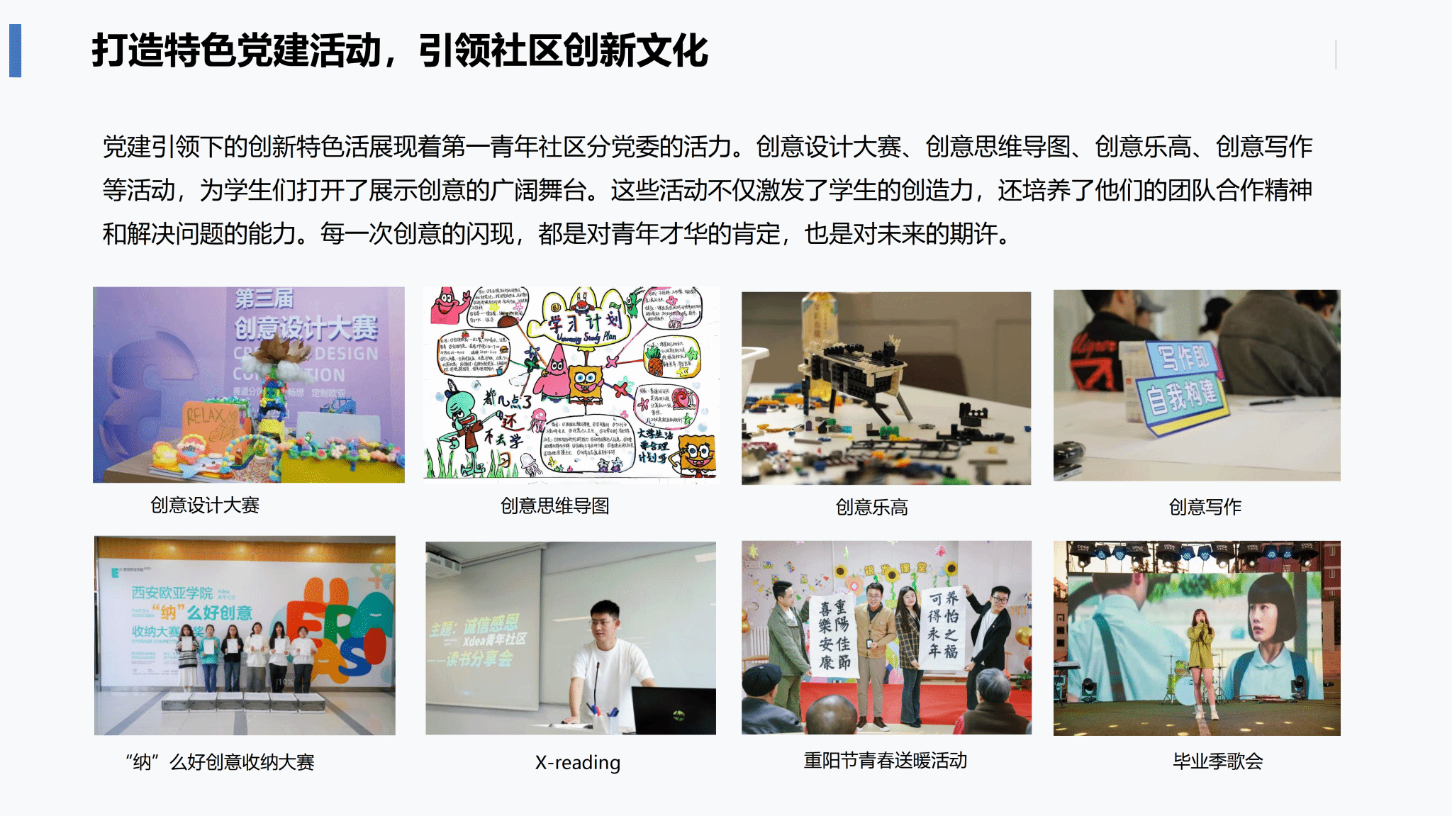 党建引领下的创新特色活展现着第一青年社区分党委的活力。创意设计大赛、创意思维导图、创意乐高、创意写作等活动,为学生们打开了展示创意的广阔舞台。这些活动不仅激发了学生的创造力,还培养了他们的团队合作精神和解决问题的能力。每一次创意的闪现,都是对青年才华的肯定,也是对未来的期许。